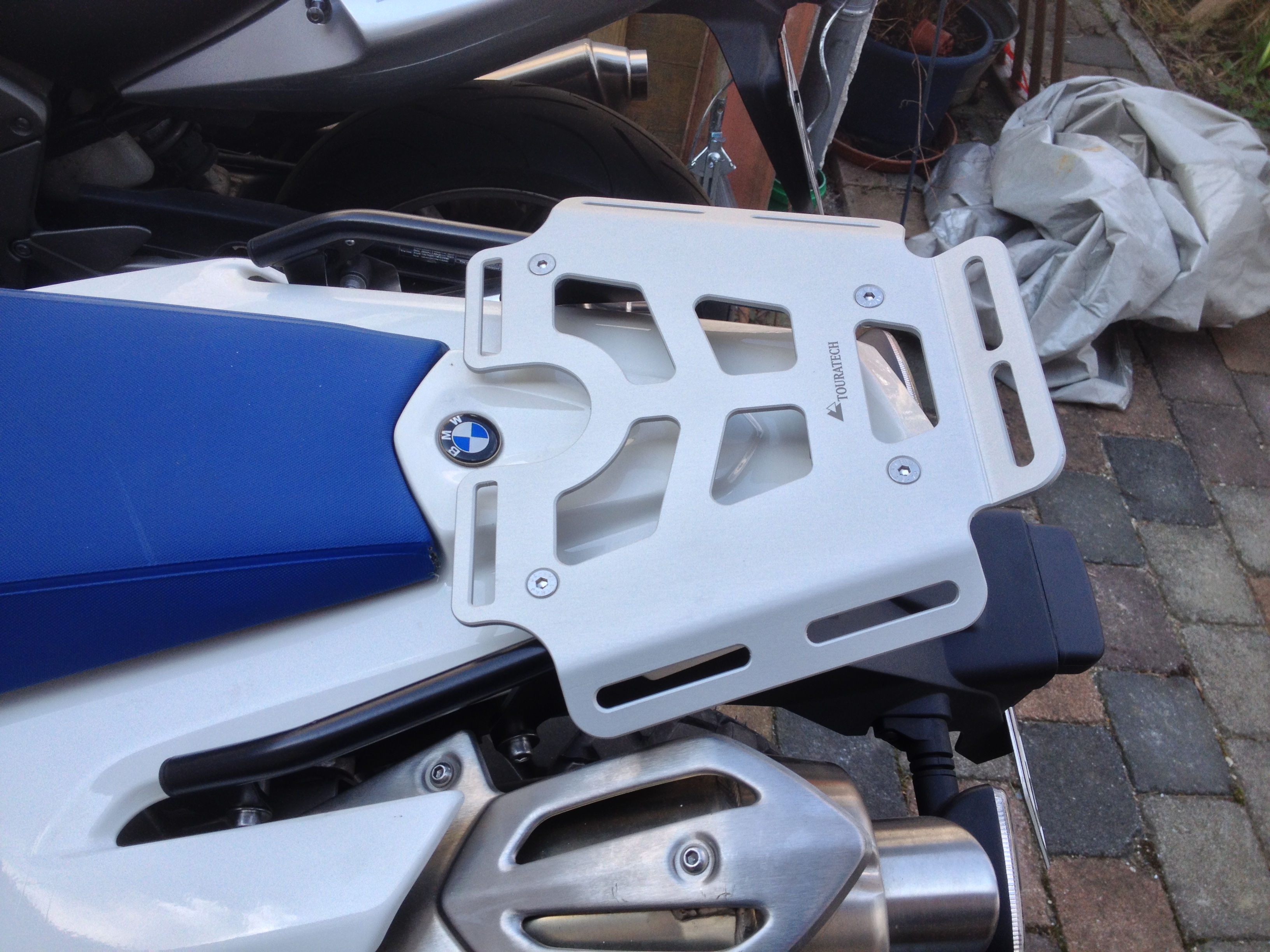 Die große Touratech-Gepäckbrücke. Wird mit vier Schrauben ähnlich wie die Sozius-Griffe aus dem BMW-Originalzubehörkatalog befestigt. Die kleinere Gepäckbrücke scheint nicht mehr lieferbar zu sein und bietet keine Haltegriffe. Antworten