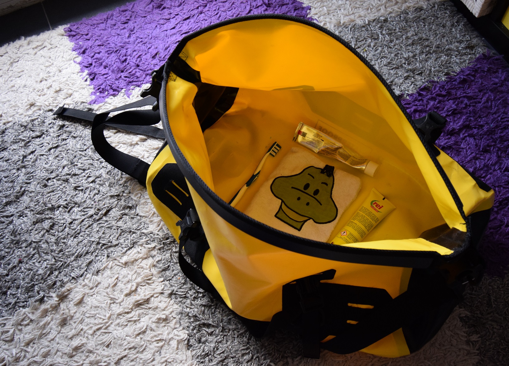 - Zahnbürste, Zahnpasta, Sonnencreme, kl. Duschgel, Tube Waschmittel, kl. Reiseapotheke, schnell trocknendes Handtuch, Mückenspray, Zeckenzange, Desinfektionstücher