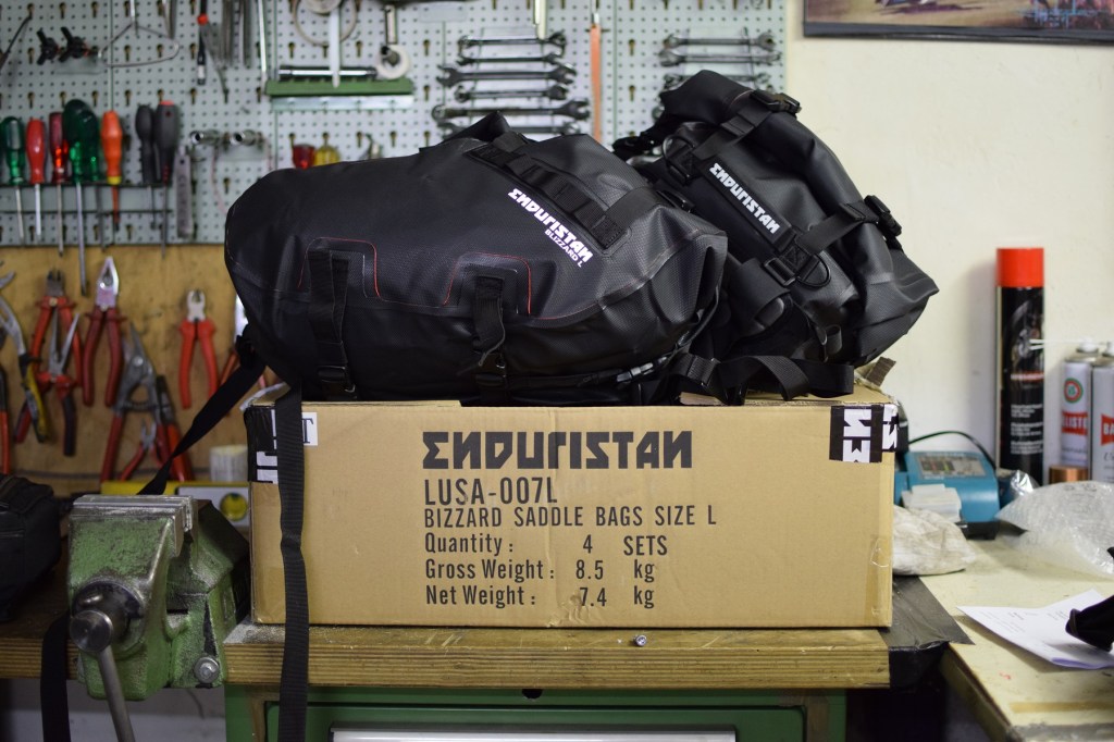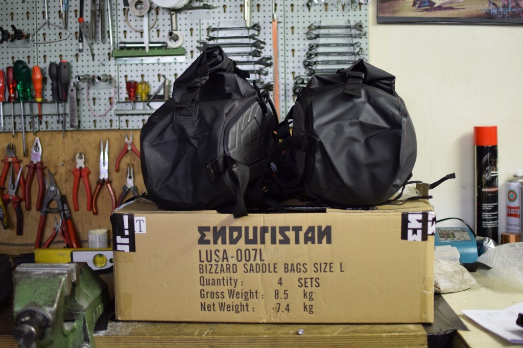 Die Schweizer Firma hat sich zuvor vor allem mit wasserdichten Tankrucksäcken und Packtaschen einen guten Namen gemacht, was sicherlich auch daran liegt, dass die Gründer selbst enduromäßig unterwegs sind. Die Satteltaschen Blizzard sind als modular erweiterbares Set gedacht, das sowohl an Sportenduros als auch an großen Reiseenduros passen soll. Ohne Kofferträger oder anderes Schwermetall. Je nach Lage des Auspuffs muss allerdings ein Hitzeschild angebaut werden, das Enduristan praktischerweise gleich mit anbietet. Die Blizzard-Taschen sind in vier Größen erhältlich: S, M, L und mittlerweile sogar XL. Die Höhe ist bei den ersten drei Varianten 24 cm, die Länge 36 cm, sie unterscheiden sich nur in der Breite. Die kleinste Größe bietet insgesamt zwölf Liter Volumen (2×6) bei einer Breite von 9 cm je Tasche. Die mittlere Größe bietet bei einer Breite von 12,5 cm je Tasche jeweils 8,5 Liter, also 17 insgesamt. Die Large-Variante bietet insgesamt 24 Liter (2×12) bei einer jeweiligen Breite von 18 cm. Durch diesen geringen Platz- und Preisunterschied (205, 230 bzw. 260 Euro) habe ich mich für die damals größten L-Blizzards entschieden.