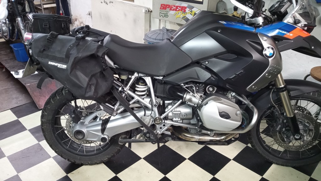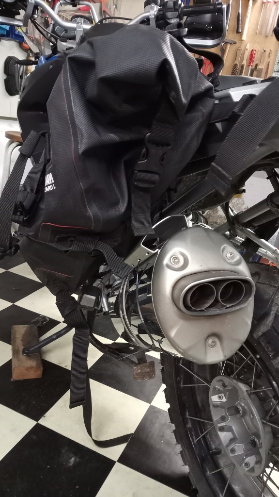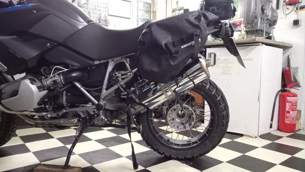 Gut gemeint, aber ich muss einsehen, dass die Blizzard-Satteltaschen einfach nicht mit dem GS-Heck harmonieren. Zumindest nicht in meiner mittlerweile favorisierten Konfiguration (ohne Soziussitz und ohne Gepäckträger). Die Gurteinstellung ist mittlerweile Routine, aber selbst mit Abstandshalter am Auspuff gefällt mir das nicht so richtig. Und die angedachte Gepäckrolle darüber würde in der Praxis nur schwer befestigen zu sein. Ich werde den Kofferträger also wieder anschrauben. Ich habe das Gestänge nicht extra nochmal gewogen, aber so viel Gewicht spart das jetzt ehrlich gesagt auch nicht. Wie im anderen Beitrag beschrieben werde ich mir also irgendwann nochmal Seitentaschen kaufen. Für alle Reisen, auf denen mir die Alukoffer eben doch zu hart und sperrig sind. Für die Xchallenge finde ich sie nach wie vor genial.