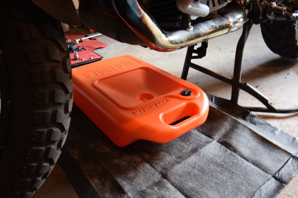 Das Motorrad nun auf den Hauptständer heben und ein ausreichend großes (mind. 4 Liter) Gefäß passend positionieren. Eine alte Kiste oder Schüssel aus Plastik sollte aufzutreiben sein. Die vermeintliche Luxuslösung für diesen Ölwechsel bestand in einem speziellen Auffangbehälter und einer darunter liegenden Ölbindematte. Trotzdem: lieber alles aus dem Weg räumen, was nicht mit Öl in Kontakt geraten sollte. Alte Kartonagen sind ein bewährter Rundumschutz. Bevor es losgeht noch zwei wichtige Tipps: Bei Auffangbehältern wie diesem unbedingt die Entlüftung öffnen. Und, bevor es an die Schraube geht, nochmal die Position checken.