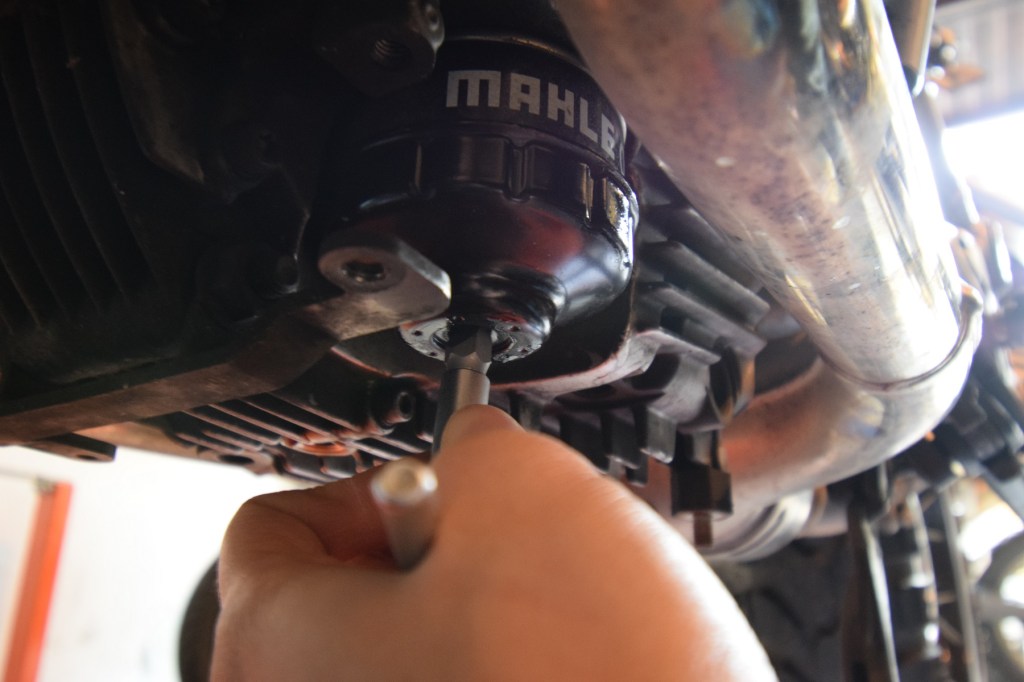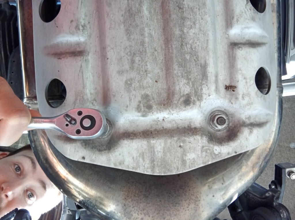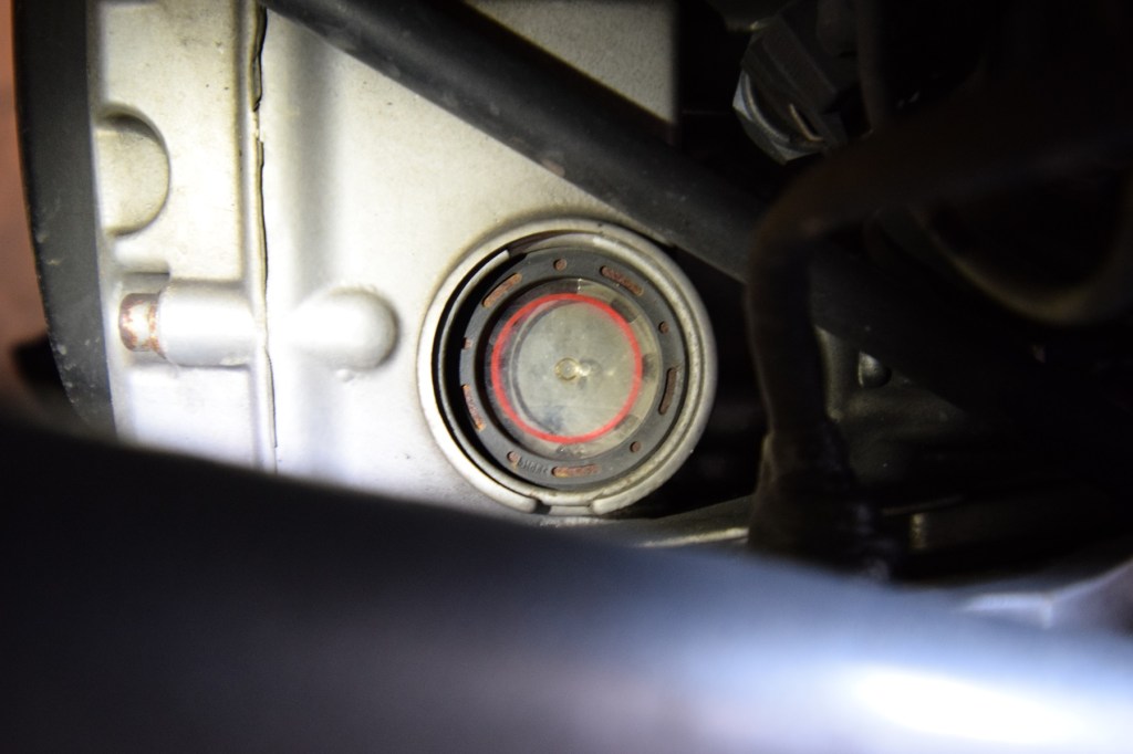 Jetzt wird es Zeit für wasserdichte Handschuhe. Zumindest ich möchte keinen Ölwechsel mehr ohne sie machen. Zuerst die Einfüllöffnung (bis Modelljahr 2009 am linken Zylinder, ab 2010 am rechten) mit dem Plastikschlüssel aus dem Bordwerkzeug öffnen. Dann die Ölablassschraube mit einer Ratsche und dem passenden Bit lösen, es wird bereits etwas Öl seitlich vorbeilaufen. Die letzten Umdrehungen besser mit der Hand herausdrehen und versuchen, die Schraube in den Fingern zu halten. Wenn das Öl noch zu heiß ist, einfach fallen lassen und später herausfischen. Sie muss sowieso gereinigt werden.