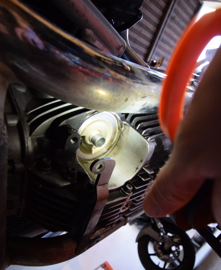 Wenn unten wieder alles gesäubert und verschlossen ist, geht es an die Oberseite des luftgekühlten Aggregats. Um Undichtigkeiten besser erkennen zu können, würde ich den Motorschutz jetzt noch nicht anschrauben. Ein wichtiger Hinweis für alle, die zum ersten Mal das Öl wechseln: Füllmenge 4 Liter heißt nicht, dass jetzt 4 Liter eingefüllt werden. Die komplette Menge bekommt man nicht heraus. Daher: erstmal „nur“ 3 bis 3,5 Liter einfüllen. Die BMW-Werkstattanleitung gibt hier schlicht die Empfehlung, auf „MAX“ aufzufüllen, was nicht falsch ist, aber an dieser Stelle nicht messbar ist. Zunächst aber zum Einfüllen: Hier empfehle ich einen Trichter und / oder etwas Geduld. Wenn etwas daneben geht, nicht schlimm, aber ständig das an der Zylinderkopfhaube herunterlaufende Öl wegwischen muss auch nicht sein. Manche Ölkanister verfügen mittlerweile auch über einen ausziehbaren Rüssel, der das passgenaue Einfüllen erleichtert. Ebenso kann die Skala am Kanister genutzt werden, ansonsten halt ein Messbecher.