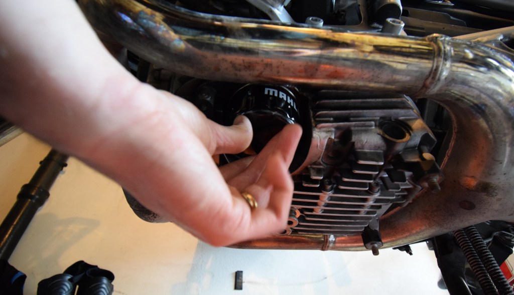 Die jetzt mit neuem Kupferdichtring versehene (und gereinigte) Ölablassschraube wieder einschrauben, zunächst mit den Fingern, dann bitte mit korrektem Drehmoment (32 Nm) oder „mit gfui“. Bevor der neue Ölfilter angeschraubt wird, soll der darin liegende Dichtring aus Gummi mit Öl benetzt werden. Da es an altem, aber hierfür ausreichenden Schmierstoff nicht mangeln sollte, einfach mit Öl aus dem Auffangbehälter bestreichen und den Dichtring wieder bündig an den Filterrand drücken. Danach auch hier zunächst mit der Hand und dann mit Gefühl anschrauben. Es sollten vier bis viereinhhalb Umdrehungen sein. Wer den Ölfilterschlüssel mit einem Drehmomentschlüssel kombinieren kann: Hier sind es 11 Nm.