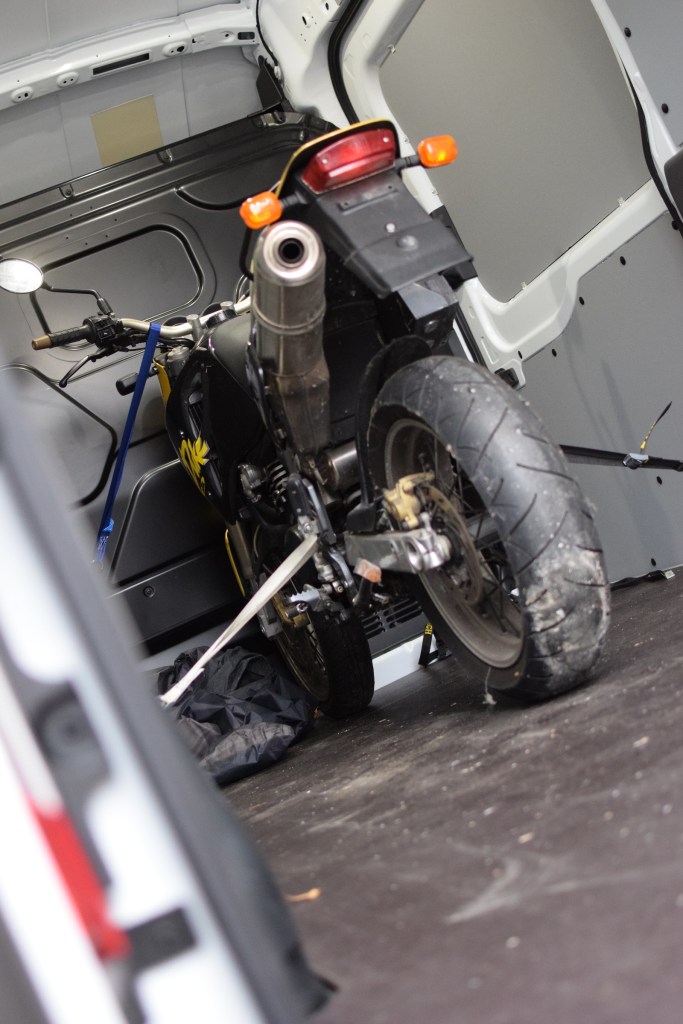 Der Wecker reißt mich um kurz vor 7 aus dem Schlaf. Ich bin sofort hellwach, wie immer, wenn ich wirklich aufstehen muss. Nach dem Kaffee mache ich mich schnell fertig, nach Corona-Maßstäben gemessen wird es ein relativ langer Tag werden. Mangels triftiger Gründe muss ich andererseits in 12,5 Stunden wieder daheim sein. Um das alles etwas zu entspannen, habe ich den Miettransporter gestern Abend noch schnell von 9:30 auf 8:30 umgebucht. Ich erwische eine S-Bahn früher und stehe bereits um 8:07 im Mini-Büro der Autovermietung mit drei Schaltern. Dort lasse ich mir immerhin nur eine von x Zusatzversicherungen aufschwatzen. Um 8:21 sitze ich im Cockpit des Transit-Transporters und hole meinen Bruder ab und werfe Spanngurte und ein Paar Handschuhe in den Frachtraum. Dass ich ein kostenloses Upgrade auf den großen Ford Transit erfahren habe freut mich wirklich, denn bis zuletzt war ich mir unsicher, ob der kleinere Transporter wirklich ausreicht. Hätte er vermutlich, aber egal. Nach entspannter Autobahnfahrt und weiteren Zwischenstopps in Freising sehe ich zum ersten Mal seit Jahren mehr von der Duke als nur Teile der Felgen und Reifen.