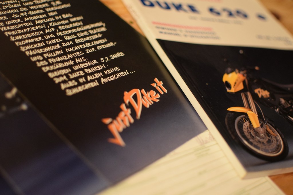 Die letzten zehn Jahre verbrachte die KTM im tiefen Winterschlaf, wobei sie sogar einen Umzug und ein Drama um eine abgelaufene TÜV-Plakette verpasst hat. Jetzt machen wir das, was mein Bruder schon vor rund fünf Jahren vorgeschlagen hat: Das Motorrad Stück für Stück herrichten, aufbereiten und wieder fahrtüchtig machen. Dabei kann ich hoffentlich auch das ein oder andere dazulernen. Ganz ohne den Stress, den ein Motorrad üblicherweise verursacht, wenn es die Garage nicht mehr aus eigener Kraft verlassen kann. Dass die Duke (Third Edition, 1996) dabei nicht umgebaut wird, versteht sich beim Seltenheitswert der ersten Straßen-KTM von selbst. Rahmen, Motor und viele weitere Teile stammen jedoch von den Enduros ab. Für alles, was das Benutzerhandbuch (heutige Bordliteratur ist ein Witz dagegen) nicht erwähnt, hilft dann die orange-weiße Reparaturanleitung für die KTM LC-4 Modelle, die ich mir in der festen Absicht irgendwann eine 640 Adventure zu kaufen schon mal „vorab“ besorgt habe. Alles Weitere zur Duke werde ich künftig in eigenen Beiträgen posten. Das Prospekt macht aufjedenfall schon richtig Lust aufs Fahren…