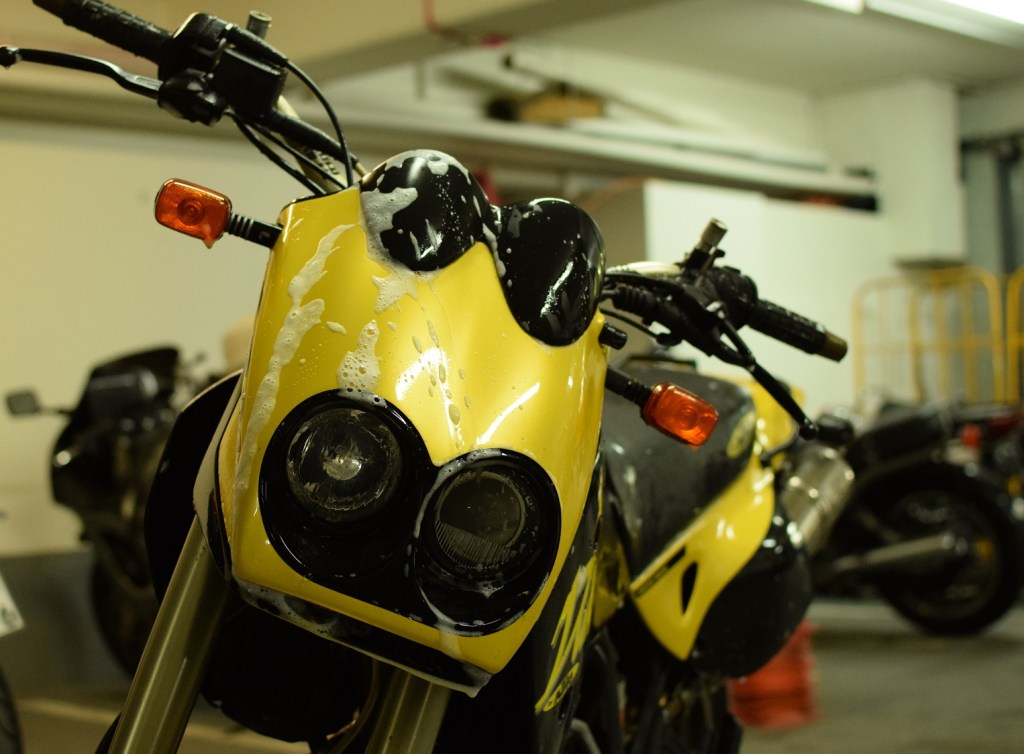 Besonderes Augenmerk lag dabei auf dem Batteriefach und der Schwinge, die durch ausgelaufene Batteriesäure optisch etwas in Mitleidenschaft gezogen wurden. Zumindest das sah hinterher ein wenig besser aus. Am meisten Wirkung zeigte die Spa-Behandlung mit zwei Waschgängen aber bei den Kunststoffflächen. Das Gelb ist jetzt wieder ein strahlendes Goldgelb, die schwarzen Seitenteile glänzen ebenfalls wieder. Das unlackierte Plastik (z. B. Tachoabdeckung) sah spätestens nach dem Trocknen jedoch wieder eher grau als schwarz aus. Wie die ein oder andere kleine Roststelle am Krümmer verbuche ich das unter „Patina“.