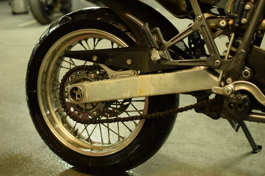 Auch die Säurerückstände an der Schwinge sahen nach dem Spülen und Trocknen fast so aus wie vorher, aber genauso wie die Felgen werden wir hier nochmal mit einer Alu-Politur nachhelfen. Gerade am Vorderrad, an der Seite der Bremsscheibe, halten sich hartnäckige Dreckpickelchen. Wenn das nichts helfen sollte, egal, Patina. Ich brauche kein Showbike, das glitzert wie eine Discokugel.