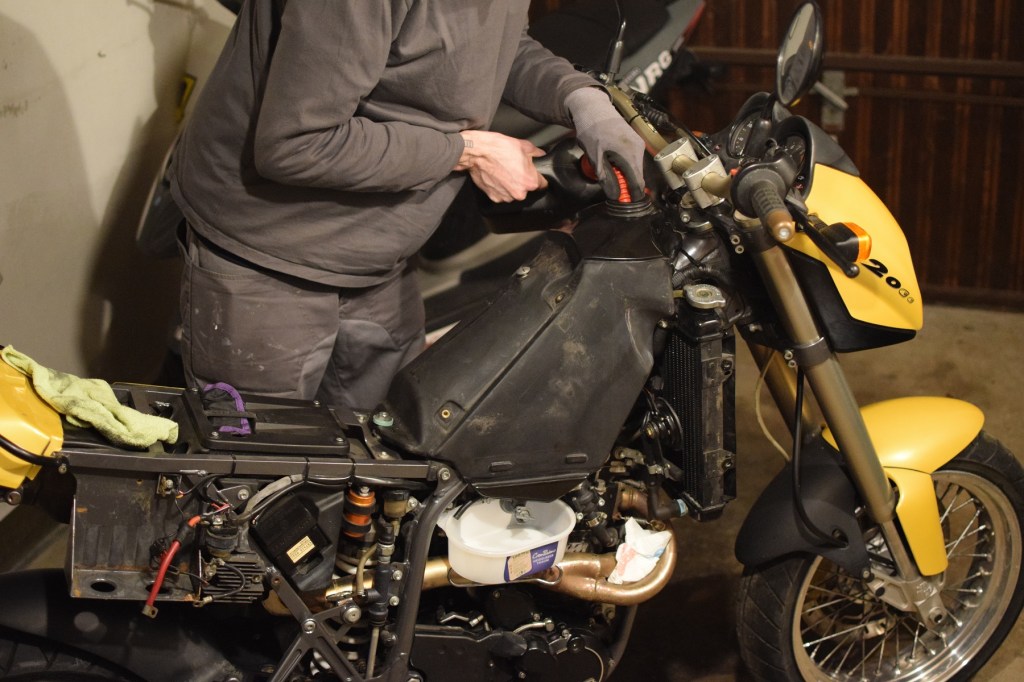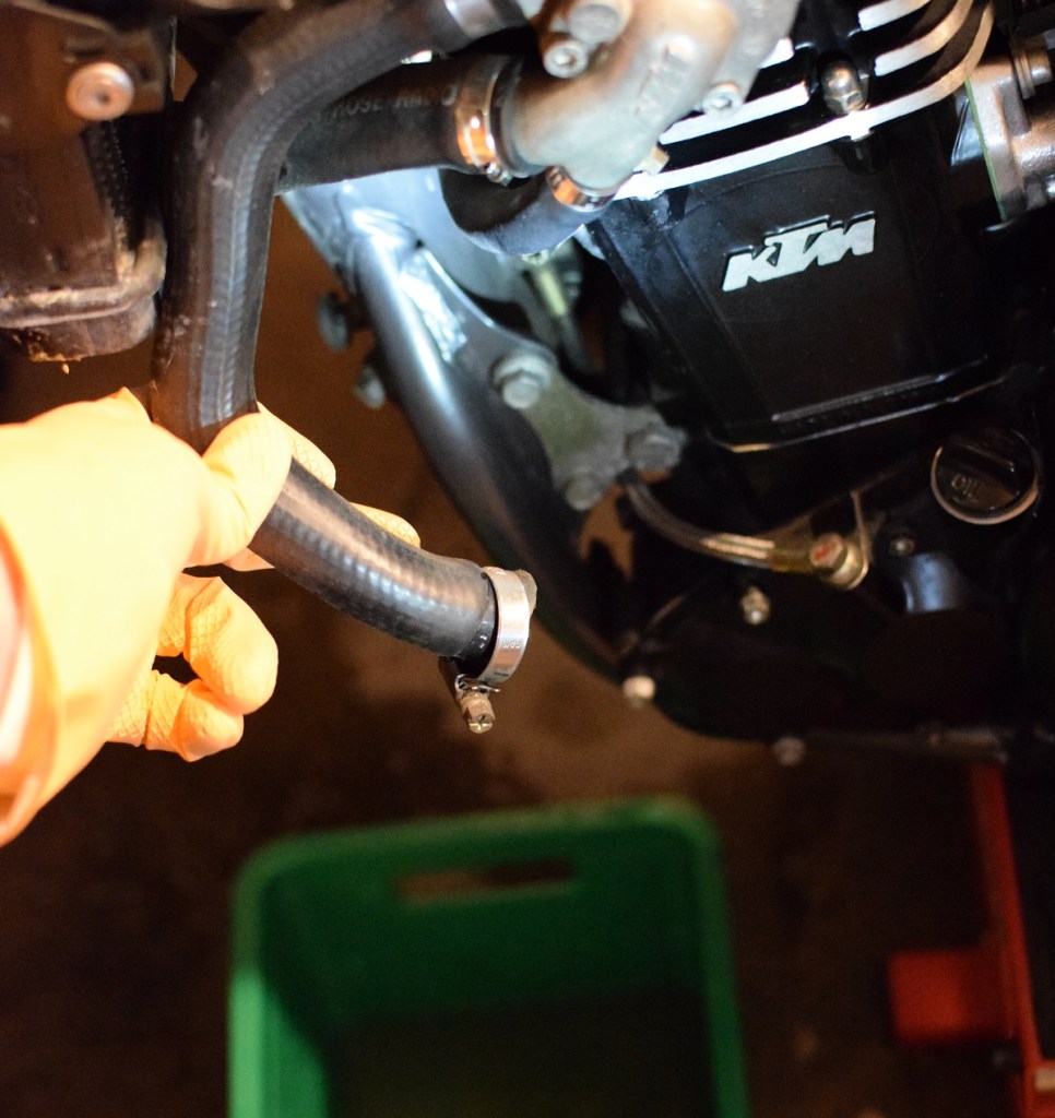 In Vorbereitung des ganzen Motor-Kapitels schien es mir wie angekündigt ratsam, vorher die Kühlflüssigkeit zu wechseln. Die soll nämlich sowieso bei kaltem Motor raus und würde dann, im Fall des ersten Startversuchs, nicht nochmal unnötig durch das System gepumpt werden. Bei meiner Xchallenge hatte ich damit noch ziemliche Berührungsängste, ber der/dem Duke galt: Es hilft ja nix. Also Schlauch abgezogen und raus damit. Sorgfältig haben wir uns dafür noch ein Ablaufblech aus einer PET-Flasche gebaut, in Erwartung der sprudelnden, schier unkontrollierbaren Fluten, die auf einem Bild in der Reparaturanleitung angekündigt werden. Doch hier: Eine herbe Enttäuschung, Flüssigkeit wechseln war wohl etwas illusorisch ausgedrückt. Es rieselten lediglich ein paar Flocken aus dem Gummischlauch. Die Frage, ob ein Spülgang sinnvoll wäre, war damit aber auch beantwortet. Mangels Gartenschlauch gossen wir ein paar Flaschen warmes Leitungswasser durch die Leitungen.