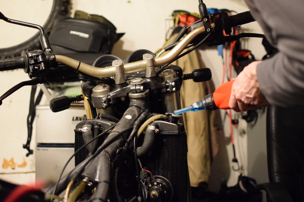 Was wir dann in der ganzen Aufregung vergessen haben: Nach dem Ölwechsel entlüften und den Kühlwasserstand checken. Außerdem tropfte etwas aus dem wieder angebrachten Kühlerschlauch, den ich wohl zu halbherzig angebracht habe. Kleinigkeiten, die ich aber bereits notiert habe. Ich habe mich ja schon zwischenzeitlich gewundert, wie schnell das alles eigentlich ging. Aber selbstverständlich kümmern wir uns zuerst um die dringenden, TÜV-relevanten Sachen. Für die Überholung des Fahrwerks und Austausch der etwas rostigen Kette ist dann immer noch Zeit. Weiter geht es daher erstmal mit dem Austausch der Bremsflüssigkeit, was wieder sehr lehrreich für mich werden dürfte.