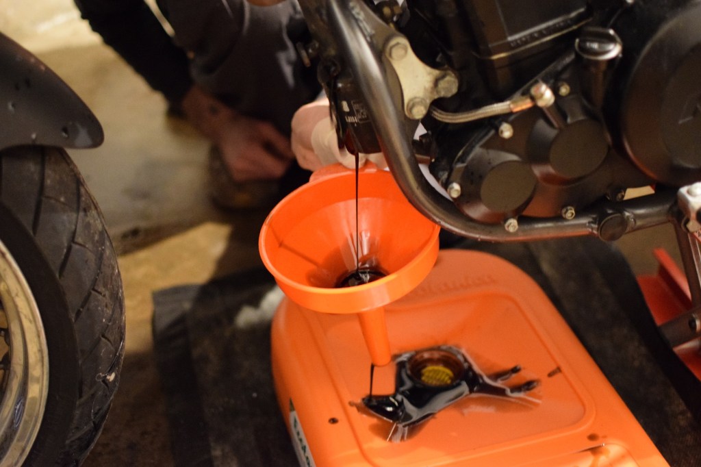 Danach ging es an Eingemachte: Der für KTM-Novizen wie mich höchst kompliziert anmutende Ölwechsel. Die ersten Schritte waren jedoch noch vergleichbar einfach. Warum es aber gleich zwei Ablassschrauben gibt, bleibt vorerst ein Rätsel. Streng genommen sogar drei, denn am Brustrohr bzw. Rahmen kam ebenfalls eine beträchtliche Menge Altöl raus. Erst dann ging es an den großen Schraubfilter (am eben jenem Brustrohr) und an den zweiten, der ähnlich wie bei meiner 650er auf der rechten unteren Motorseite untergebracht ist und dem, genau wie beim Filter der Rotax-650er, Ähnlichkeiten zu einer Klorolle nachgesagt werden. An den davon weggehenden Ölleitungen waren dann auch noch drei Dichtringe zu wechseln. Fehlt nur noch das Entlüften, das wir beim nächsten Motorstart erledigen werden. Für weitere Verwirrung sorgten die Widersprüche zwischen Duke-Besitzerhandbuch (von 1996) und der etwas allgemeiner gehaltenen Reparaturanleitung für sämtliche LC4-Motoren. Nach alter Lesart werden 2,1 Liter eingefüllt, gestartet und entlüftet, bis Öl an einer Entlüfterschraube (eine weitere, oben am Rahmen) austritt. Fertig. Nach neuer Lesart kommen in den Motor nur 1,3 bis 1,5 Liter und die restlichen 600 Milliliter werden mit einer Spritze oben in das Brustrohr eingefüllt und dann entlüftet. Ja mei. Dieses Mal haben wir uns für die alte Art entschieden, der Motor wird es uns bestimmt nochmal verzeihen. Als reines Spül-Öl war uns das zu schade, aber dafür plane ich den nächsten Ölwechsel (wie das Kühlwasser) schon deutlich früher, nach ein paar Betriebsstunden bzw. wenigen Hundert Kilometern.