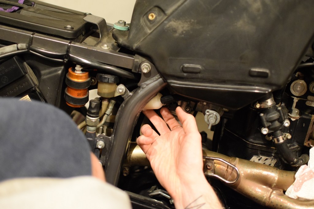 Vor dem Abziehen und Auftrennen der Benzinleitungen entdeckte ich im Regal noch eine etwas längere, ummantelte Spritleitung, die ich sonst benutze, um bei der G650X das Öl aus dem Öltank abzulassen. Somit hatten wir nochmal mehr Material und konnten die Filter und Leitungen relativ elegant verlegen, den vorderen Filter mit einem Kabelbinder sogar noch etwas mehr Abstand zum bald warm werdenden Krümmer verschaffen. Hält gut und dicht.