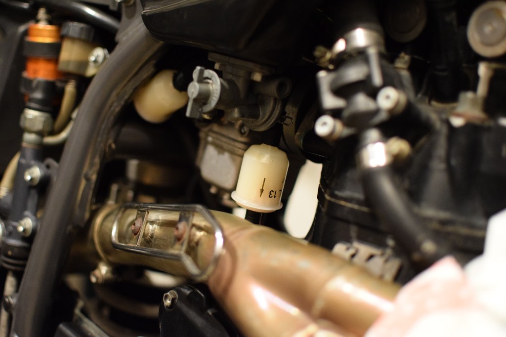 Mit dem frisch eingebauten Vergaser konnte nun auch wieder der Tank angebaut werden. Nächste Herausforderung: Die Kraftstofffilter irgendwie zwischen die beiden Leitungen bringen, was bei den Platzverhältnissen und der Nähe zum Krümmer gar nicht so einfach war. Schien aber eine bessere Lösung, als irgendwelche Chemiebomben auf Verdacht in den Tank zu geben. Vorher überprüften wir noch, ob der Benzinhahn überhaupt Sprit durchlässt. Hier war nichts verharzt oder verstopft, wieder eine Sorge weniger. Dafür, und natürlich für die spätere Feuerprobe, hatte ich vorhin extra noch drei Liter vom guten Super Plus getankt.