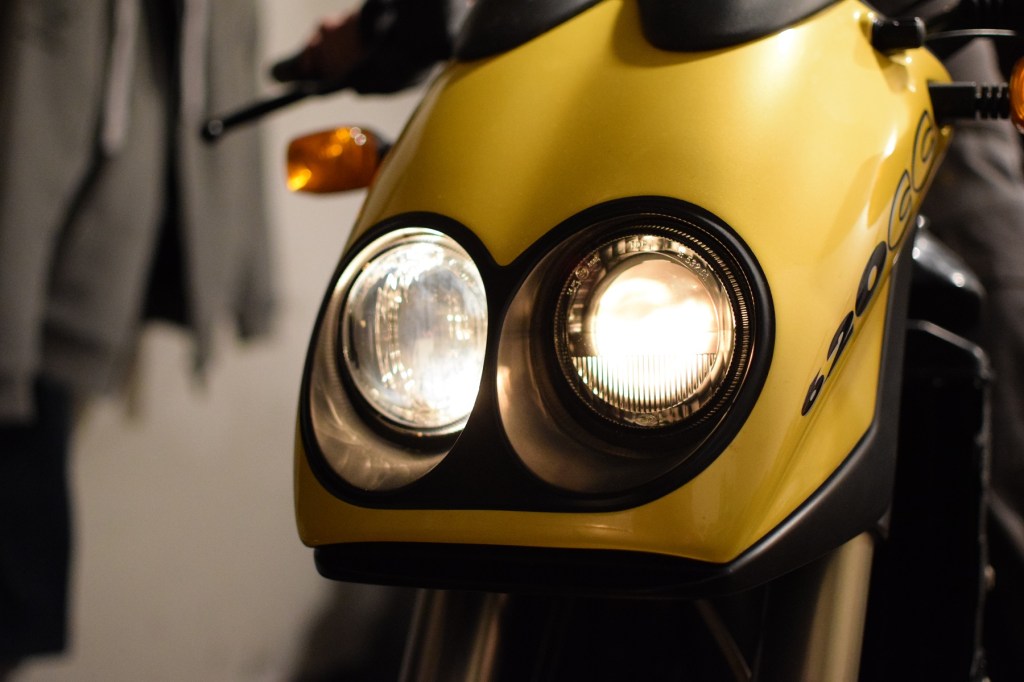 Mit dem Anschliessen der Batterie stieg die Vorfreude. In der Nähe des Gleichrichters konnte man ein leises surren hören, so als ob auch die Elektrik erstmal warm werden müsste. Aber Zündung und alle Lampen waren soweit schon mal ok. Hätte ja auch anders sein können. Damit blickte Herr Duke seit langem mal wieder einäugig in die Welt. Unsere Erwartungshaltung war unterschiedlich: Ich sah naiverweise keinen Grund, warum sie nicht anspringen sollte. Mein Bruder, der die Start-Allüren der Duke schon nach zwei Wochen Stillstand kannte, rechnete nicht wirklich damit. Nach einigen Ankick-Versuchen (ja ja, kick ten minutes) brachten wir den E-Starter zum orgeln und die Nachbarschaft womöglich an die Fenster… dann pulsierte das zweite Auge im Takt des Anlassers. Und der Duke erwachte schüttelnd und rüttelnd (und mit viel zu hoch eingestelltem Standgas) aus dem Winterschlaf: