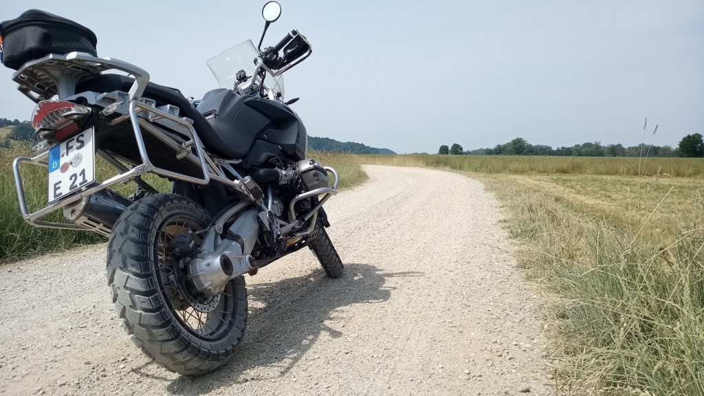Statt Fortschritte an der Duke (die es spätestens im Herbst und Winter wieder geben wird) habe ich meine begrenzte Zeit eher dafür investiert, Kleinigkeiten an den fahrfähigen Motorrädern auszubessern. Nach der großen Kofferaktion an der GS wurde es Zeit, die Bremsbeläge zu wechseln (easy). Die Reifen habe ich bei einer Werkstattgelegenheit jedoch aufziehen lassen. Die von mir geschätzten Mitas E-07 hätten sicherlich noch 2000 Kilometer oder länger gehalten, mit meinen ursprünglichen Reiseplänen (mal wieder Balkan) wäre das jedoch etwas knapp geworden. Daher fahre ich jetzt den berühmten Kompromissreifen aus Heidenau, den K60 Scout, der konzeptionell quasi deckungsgleich mit dem Mitas ist. Die Kombination aus neuen Reifen und neuen Bremsbelägen war anfangs sehr merkwürdig, nach ein paar Hundert Kilometern hat sich das aber gelegt.