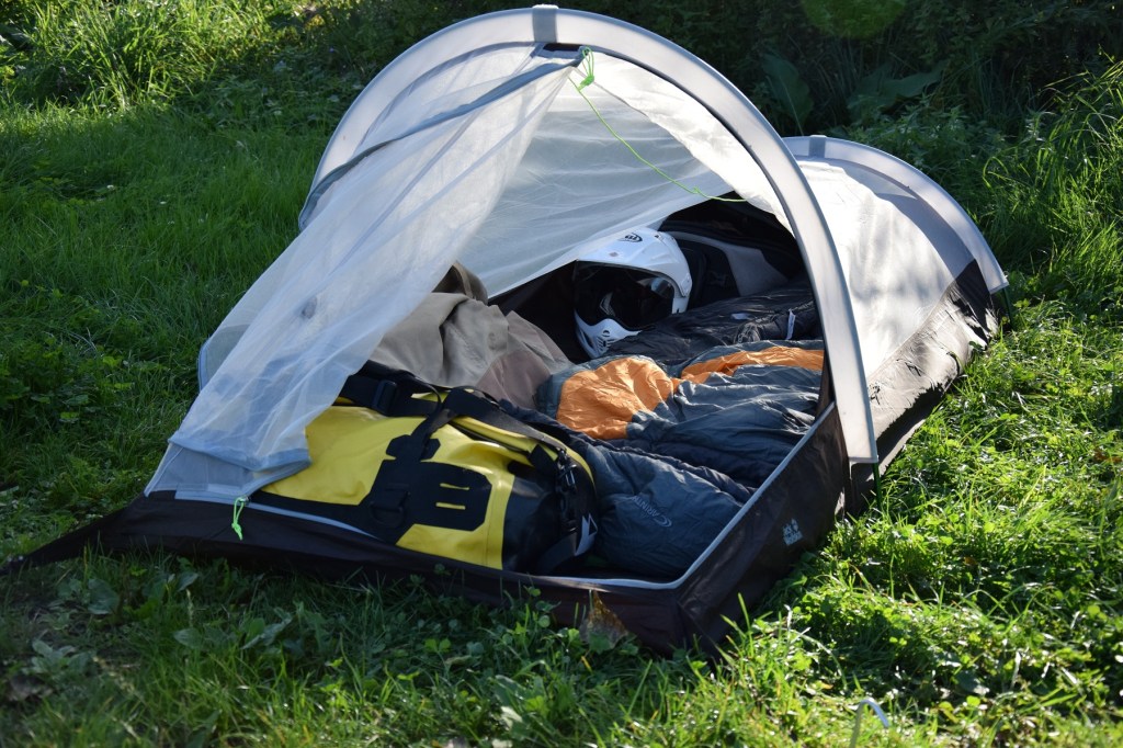 Die spannendste Frage war jedoch immer, ob das kompakte Tunnelzelt genügend Platz für Motorradfahrer bietet. Nach mittlerweile insgesamt zwei Wochen im Gossamer sage ich: Ja. Oder lieber: Jein. Denn es kommt darauf an, ob man sich damit arrangieren kann und möchte. Andere werden das anders sehen und zu anderen, größeren Zelten raten. Der größte Nachteil dieser Tunnelkonstruktion ist, dass man nicht im Zelt sitzen kann. Wenn es trocken ist, kann man sich höchstens in den Eingang setzen. Und auch das ist eher ein buckeln als sitzen. Bei Regen bleibt nur, sich im Zelt zusammenzufalten. Insbesondere blöd, wenn die Sachen noch nicht ausgepackt sind und die dreckigen Motorradstiefel noch an den Füßen sind… fast alles muss man vor dem Zelt erledigen: an- und ausziehen, Sachen ein- und auspacken, Schlafsack und Isomatte zusammenrollen… Ist es trocken, kann man sich jedoch gut arrangieren und den beschränkten Platz sinnvoll ausfüllen. Aber auch im Regen habe ich irgendwie alles ins Zelt bekommen, hatte auch mit 1,87 genügend Platz im Zelt. Motorradjacke, -hose und Helm lagen links neben mir, der kleine Rucksack im Fußbereich, Kleinigkeiten (Wasserflasche, Funktionsunterwäsche, Handschuhe, Handy etc.) lagen unsortiert dazwischen. Die Stiefel standen regensicher im schmalen Bereich zwischen Innen- und Außenzelt (Kopfseite).