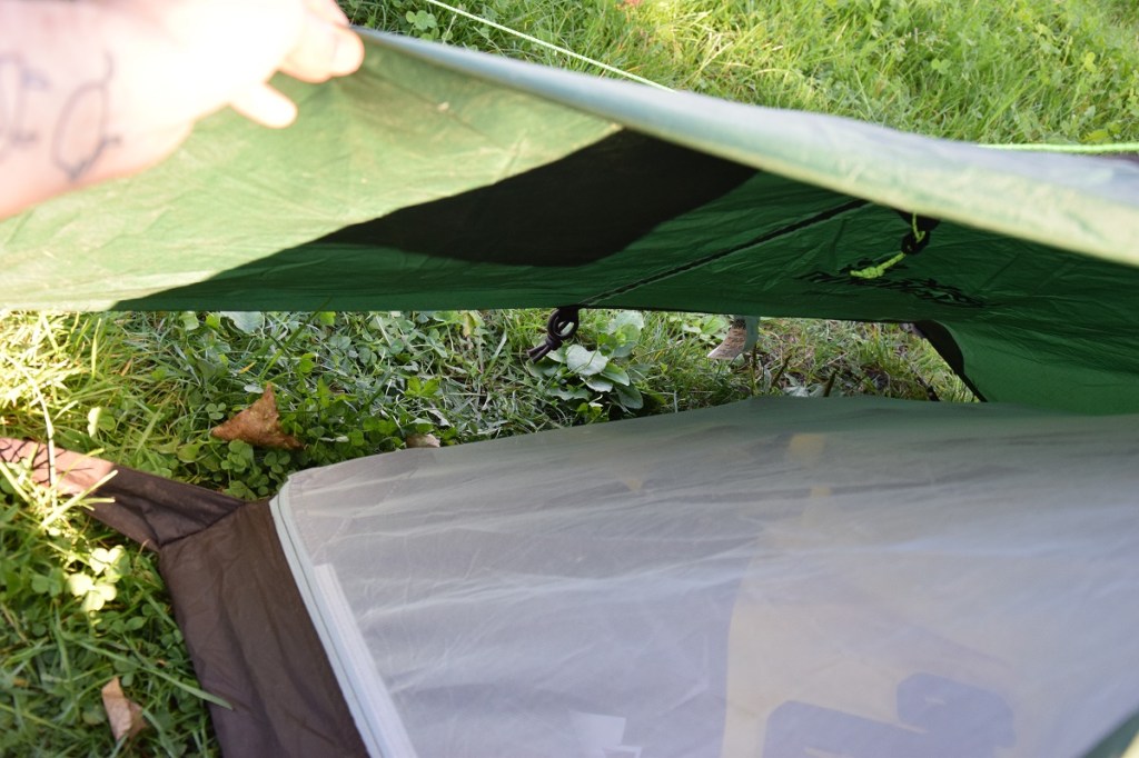 Mit zwei wertig wirkenden Zeltstangen und vier Heringen ist das Innenzelt schnell aufgebaut, zumindest wenn man es vorher einmal zuhause geübt hat. Das hat sich besonders bei schnell einsetzendem Regen oder Dunkelheit (oder beides zusammen auf dem bosnischen Trans Euro Trail) bezahlt gemacht. Alles, was nicht nass werden sollte konnte ich dann schnell ins Zelt werfen und die wasserdichte Außenhülle drüberlegen. Die fünf übrig gebliebenen Heringe reichen nur bedingt um die Außenhülle straff abzuspannen. Daher musste ich mit stabilen Ästen oder der Befestigung am Mopedkoffer improvisieren. In einer Nacht mit starkem Wind flatterte die Außenhülle lautstark vor sich hin, da hatte ich jedoch nicht mehr die Muße daran etwas zu ändern. Mit (bei den nächsten Malen) gut gespannter Außenhülle überstand das Zelt auch verregenete Nächte, inklusive Starkregen und Gewitter. Drinnen blieb alles trocken, auch dank der wannenartigen Unterlage. An fast allen Stellen ist genügend Abstand zwischen Innen- und Außenzelt, Kondenswasser bildete sich nur am Fußende meines Schlafsacks. Bei einer Nacht im Herbst war die Innenseite schon vor dem Einschlafen nass, Feuchtigkeit kam jedoch nur an den Stellen durch, wo sich Innen- und Außenzelt berührten, klar. So etwa am Helm, der durch seine Höhe im Fußbereich das Innenzelt gegen die Außenhülle drückte.
