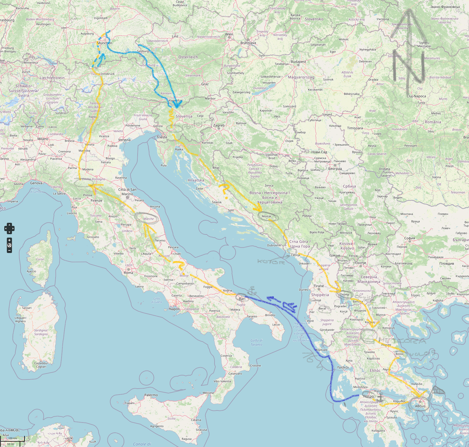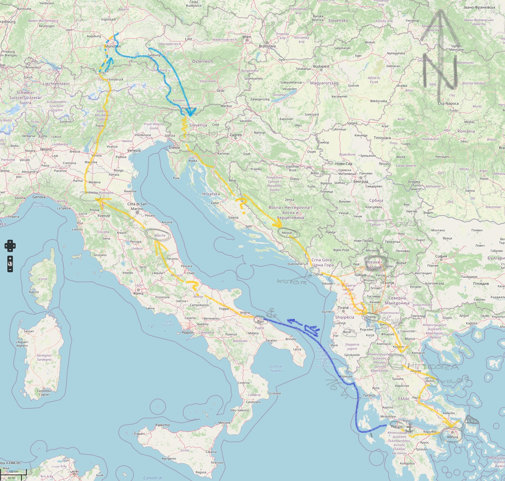 Habe mal grob die Route überschlagen (Überraschung…): Die Balkan-Etappe mit Endpunkt Patras kommt auf rund 3300 Kilometer, die Italienetappe auf rund 1600. Das ist jetzt keine Fernreise, rein statistisch finde ich das dennoch interessant, gerade um es mal im Verhältnis zu Inspektionsintervallen (10 000) und der zu erwartenden Lebensdauer der Reifen (je nach Typ rund 4000 bis über 10 000) zu setzen. Als Zeitraum wird August/September konkreter.