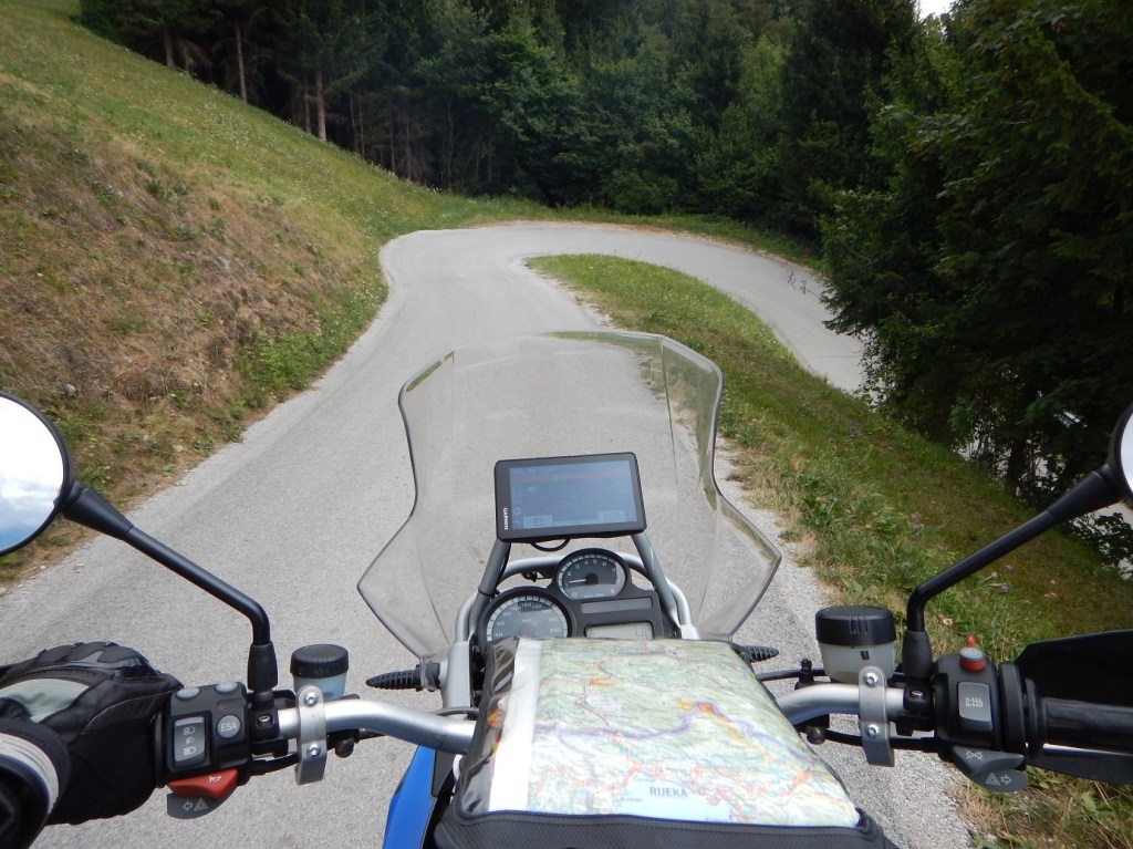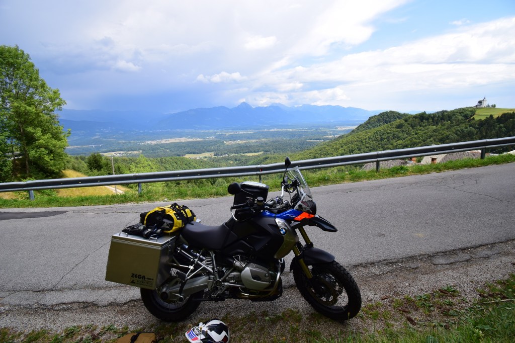 Nach einem Tankstopp irgendwo in Österreich ziehen dunkle Wolken auf, es regnet zwar nur kurz, die Regenjacke macht die Fahrt trotzdem angenehmer, denn es ist ganz schön frisch. Ich freue mich auch über meinen Midlayer, den ich bei früheren Reisen womöglich daheim gelassen hätte. Weil „August!?“. Im Karawankentunnel wird das kurzzeitig zum Bumerang und der Motorradanzug zur tragbaren Sauna. Nach der slowenischen Grenze lasse ich sämtliche Wolken erstmal hinter mir, auf der anderen Spur bemerke ich den kilometerlangen Stau. Ich halte Ausschau nach der Ausfahrt, die mich etwas kurvenreicher über Škofja Loka nach Postojna führen soll. Es wird schnell kurvig, kleinteilig und kennzeichentechnisch lokal. Vorerst keine Spur mehr von anderen Touristen. Um nicht in meine übliche Bequemlichkeit zu verfallen, halte ich nach ein paar Höhenmetern für ein Foto. Wirklich zufrieden bin ich damit nicht, aber das liegt auch an meiner grundsätzlich noch nicht allzu guten Laune. Auch die ganze Ausrüstung und vor allem wo ich was untergebracht habe muss sich noch etwas einschleifen.