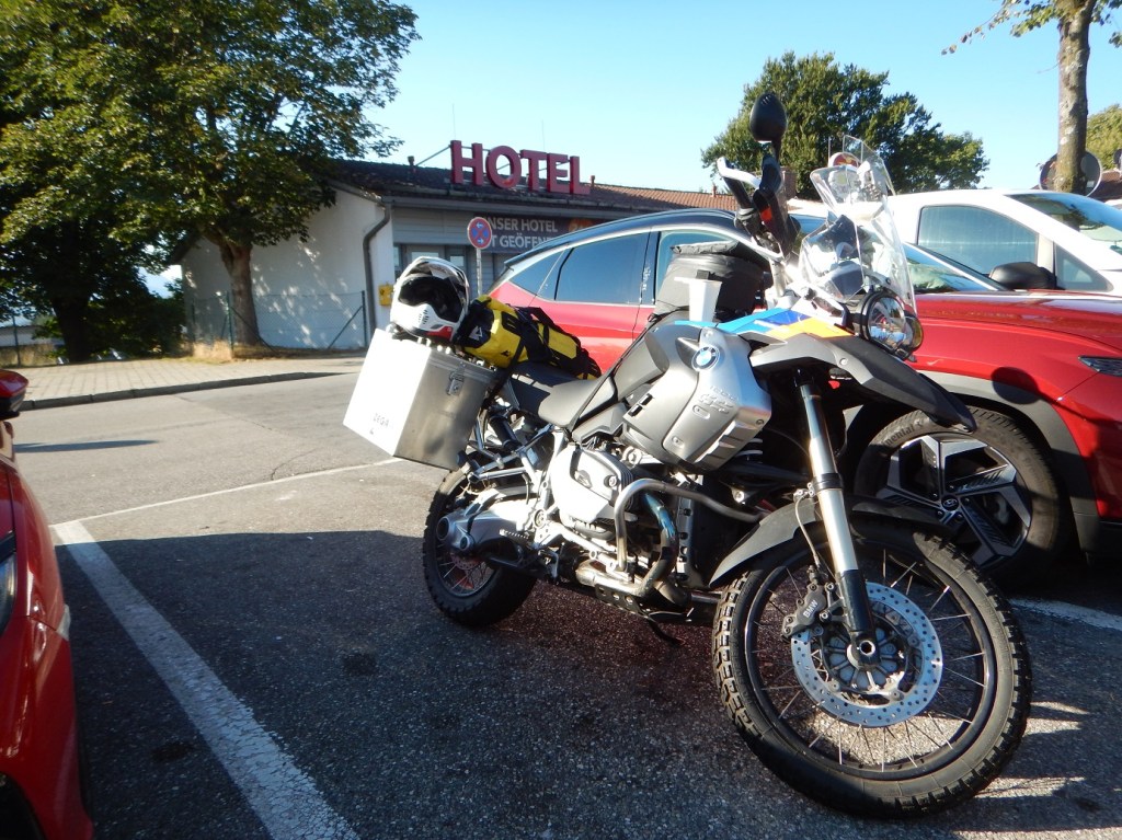 Da fiebert man über Wochen immer wieder auf diesen Moment hin, wo man endlich die Taschen in die Koffer stopft, das Gepäck aufschnallt, den Kilometerzähler zurücksetzt und das Ziel ins Navi eintippt. Und dann ist alles irgendwie so unspektakulär wie der tägliche Weg in die Arbeit. Nach einer ereignislosen Stunde halte ich am Irschenberg und bekomme das beliebte Pickerl nicht nur digital, sondern auch noch in Kombination mit der slowenischen Vignette, den ersten Kaffee der Reise gibt’s praktischerweise gleich nebenan. Der erste Stopp ist gleichzeitig die erste Übung in der Disziplin „was nehme ich mit, was lasse ich alles am Motorrad und aus den Augen?“. Das Navi stecke ich in die Tasche, den Helm nehme ich in die Hand, den Tankrucksack abzuschnallen ist mir aber zu blöd.