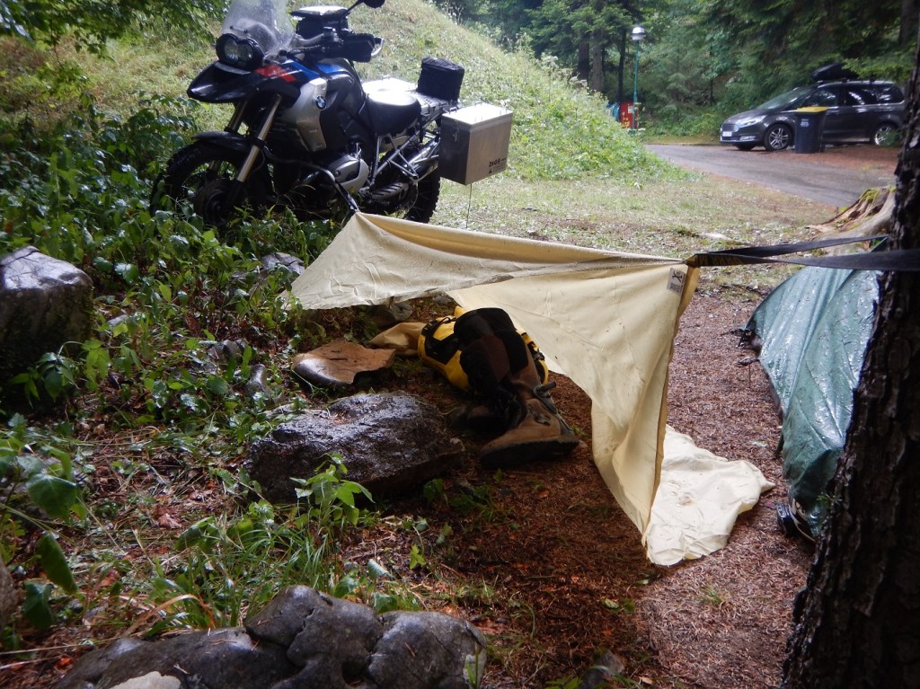 Noch ungeklärt ist, wo die WCs sind und ob ich heute dusche. Zelten und Campingplätze bedeuten für mich immer noch viele große und kleine Fragezeichen, die ich nur teilweise vorher bedacht habe. Bevor ich weiter überlegen kann, zieht eine dunkle Wolke über den Campingplatz und es nieselt, was mit meinen halb ausgepackten Sachen echt blöd ist. Es donnert und aus den Tropfen wird schnell Hagel, ja super. Jetzt ist Einfallsreichtum gefragt. Kurz verfluche ich die Tatsache, dass ich den üblichen Ratschlag, ein Zweierzelt zu kaufen, aus Platz- und Budgetgründen ignoriert habe. Naja, ein paar Sachen habe ich schon ins Zelt geschmissen, für das andere will ich mein dafür mitgebrachtes Tarp aufspannen. Mit zwei Spanngurten befestige ich es an Baum und Sturzbügel, mit einem Hering wird ein halbwegs gespanntes Dreieck daraus, unter dem Stiefel und Gepäckrolle vorerst regensicher verschwinden.