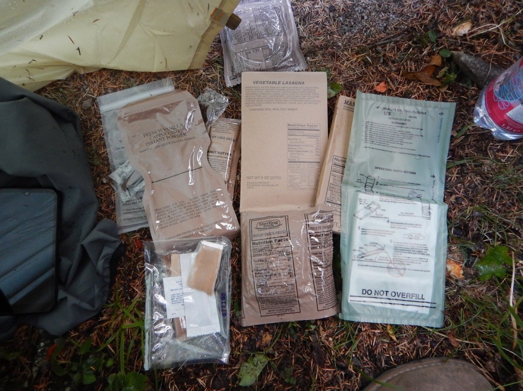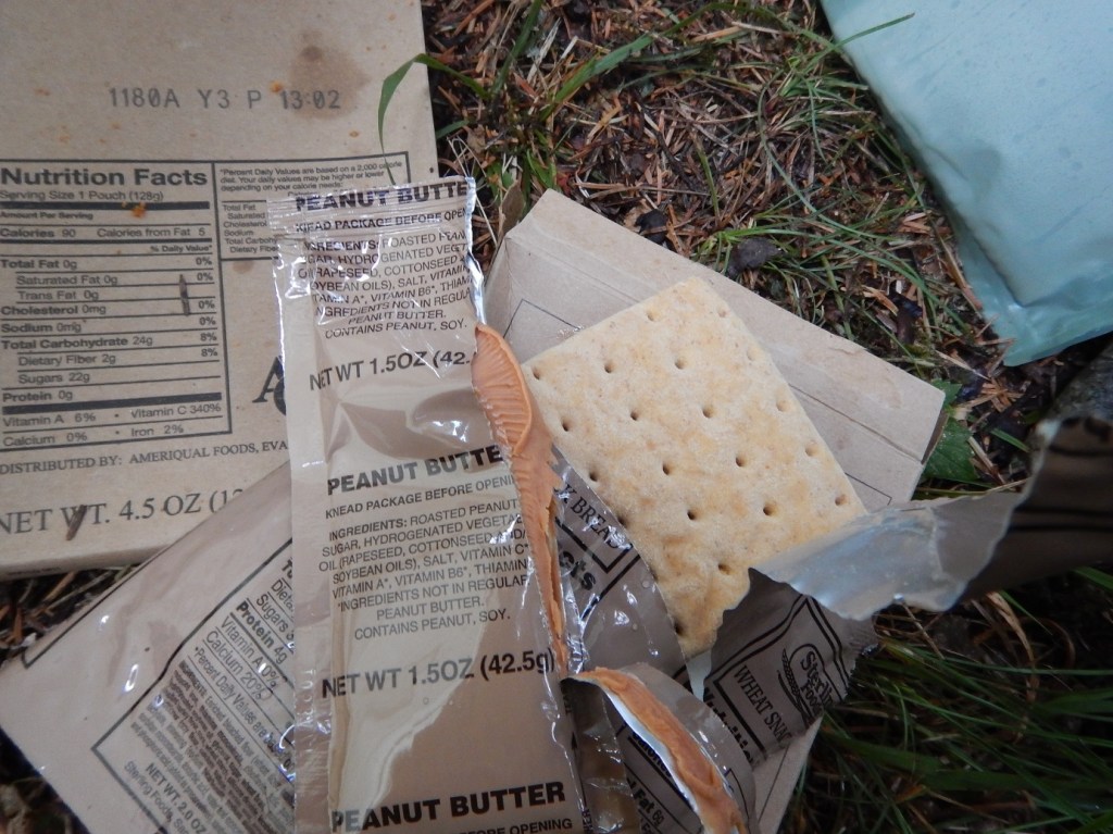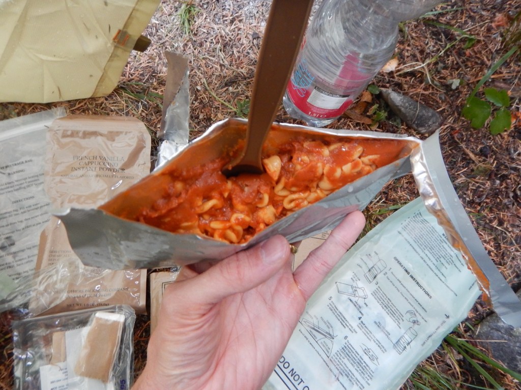 Das MRE ist eine Feldverpflegung der US-Armee, die ich vor ungefähr zehn Jahren von einem amerikanischen Soldaten in Grafenwöhr bekommen habe, das kann man aber auch so kaufen. Diese zehn Jahre habe ich das jedenfalls aufgehoben und immer auf eine gute oder bessere Gelegenheit gewartet. Jetzt versuche ich im Verbrauchen der Wundertüte etwas symbolisches zu sehen. Etwa stellvertretend für den Ballast, den ich immer noch aus meiner Zeit in Flecktarn herumschleppe. Den ich übrigens auch ohne Auslandseinsatz angesammelt habe. Es funktioniert natürlich nicht und das als Tagesmenü gedachte Essen ist zudem ziemlich unterwältigend. Die offensichtlichsten Chemiebomben lasse ich gleich ganz weg, die vegetarische Lasagne (die eher eine Art veget. Bolognese ist) schmeckt logischerweise superkünstlich und ist viel zu wenig. Vielleicht besser so. Der einzige Lichtblick bleibt die Erdnussbutter. Und, ok, die Kekse sind auch nicht schlecht. Naja, hat man das auch mal gemacht, morgen kaufe ich sowieso etwas im Supermarkt. Der erste Tag bzw. Abend war in mancher Hinsicht also nicht wirklich toll, auch weil es in der Nacht und in der Früh weiter regnen soll, aber so habe ich wenigstens etwas mehr zu erzählen, denke ich. Außerdem kann es ja eigentlich nur wärmer und besser werden!