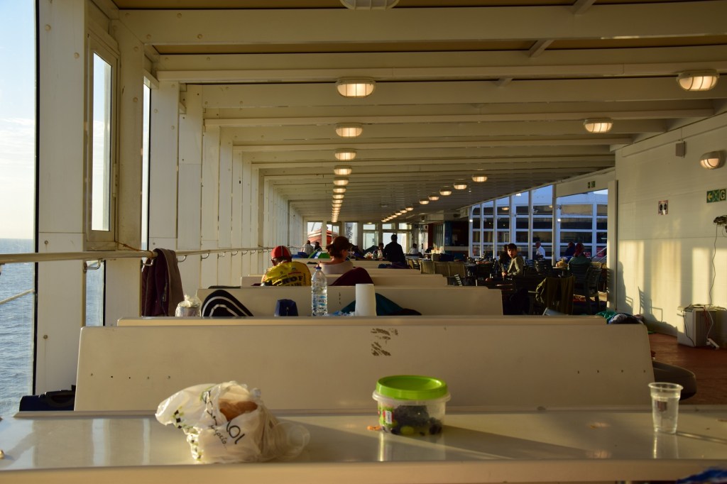 Auf dem Gang schaue ich erstmal blöd, denn überall liegen schlafende Menschen, selbst auf den Treppenaufgängen, im Barbereich, zwischen den Stühlen, auf den Gängen. Nur im pseudo-vornehmen „à la carte“-Restaurant hat sich keiner über die Absperrung getraut. Das Highlight ist eine Hängematte, die über einen leeren Whirlpool gespannt wurde. Ich hole mir einen Kaffee, sitze mal hier, mal da, und muss dabei häufig noch über ausgestreckte Füße steigen. Dabei entdecke ich mindestens drei gute Plätze an Deck, wo ich mich hätte ausbreiten können. Naja, ich bin ja selbst schuld. Ich habe nicht den Orient-Express (oder besser gesagt: einen Luxusliner) erwartet, vor allem weiß ich es ja eigentlich besser. Aber dieses Mal verflog das letzte Quäntchen Reiseromantik bereits im Hafen von Patras. Jetzt, wo das Schiff so voll ist, nervt es mich nur noch. Das Bild, das sich mehr und mehr aufdrängt ist das einer XXL-Autobahnraststätte auf See. Alles ist grintig, aber nicht im „used universe“-Sinne der Star Wars Filme. Sondern im Sinne von abgegriffen, unhygienisch, billig. Die schlecht gelaunte Crew und das Heer aus Türzuhauern, Danebenbrunzern, Nicht-Händewaschern und Ohne-Kopfhörer-Videos-auf-dem-Handy-Schauer macht es nicht besser. Aber vielleicht bin auch nur ich komisch. Oder übermüdet. Ich glaube langsam zu wissen, was mich daran so stört. Es ist die Diskrepanz zwischen dem, wie die Fähre angekündigt und beworben wird und dem, wie die Überfahrt dann ist. Aber vielleicht sollte ich mich als Holzklasse-Passagier auch einfach nicht beschweren. Es ist wie die letzten Male trotzdem eine in vielerlei Hinsicht interessante Erfahrung, um die ich später auch froh sein werde.