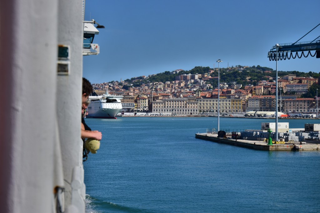 Ungeduldig schaue ich auf das Navi, wo die italienische Landmasse Pixel für Pixel näher kommt. Ich weiß nicht, wann mir das letzte mal so langweilig war. Die Fahrt dauert einfach zu lange. Noch so ein Grund, warum ich lieber nach Bari gefahren wäre. Aus meinem Plan, alle restlichen Bordleistungen zu boykottieren wird daher nichts. Rund zwei Stunden vor Ankunft kippe ich nochmal einen Espresso in mich rein, esse wieder eine mit Käse gefüllte Sesamstange und verbringe die restliche Zeit im Schatten des großen Schornsteins.