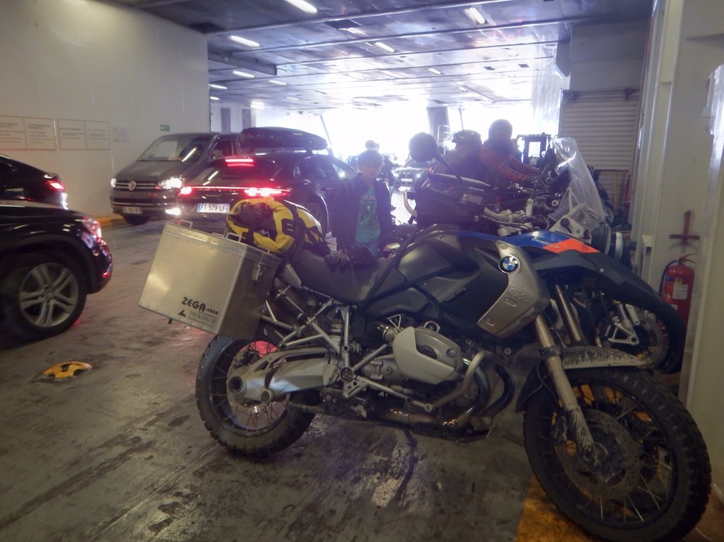 Irgendwann wird Italien auch mit den Augen sichtbar, Ancona wird immer größer. Endlich. Es fühlt sich so an, wie in München zu landen, wie daheim anzukommen. Das anschließende Gedränge dämpft die Freude wieder etwas, aber nach ein paar Minuten kommt die Schlange aufeinmal in Bewegung und ich stehe wieder auf Deck 3, vor mir zweieinhalb Reihen Autos, die Stoßstange an Stoßstange stehen. Ich halte die Gepäckrolle und den Helm so hoch wie möglich und suche mir einen Weg durch die Blechlawine. Auf der anderen Seite fahren Autos schon wieder auf das Schiff. Ich habe immerhin genug Platz, um etwas zu rangieren. Vor lauter Hektik bleibt mir keine Zeit mich darüber zu freuen, dass mein Motorrad während der Überfahrt offensichtlich nicht übers Deck geschlittert ist, sondern dort steht, wo ich es gestern auf den Seitenständer geparkt habe.