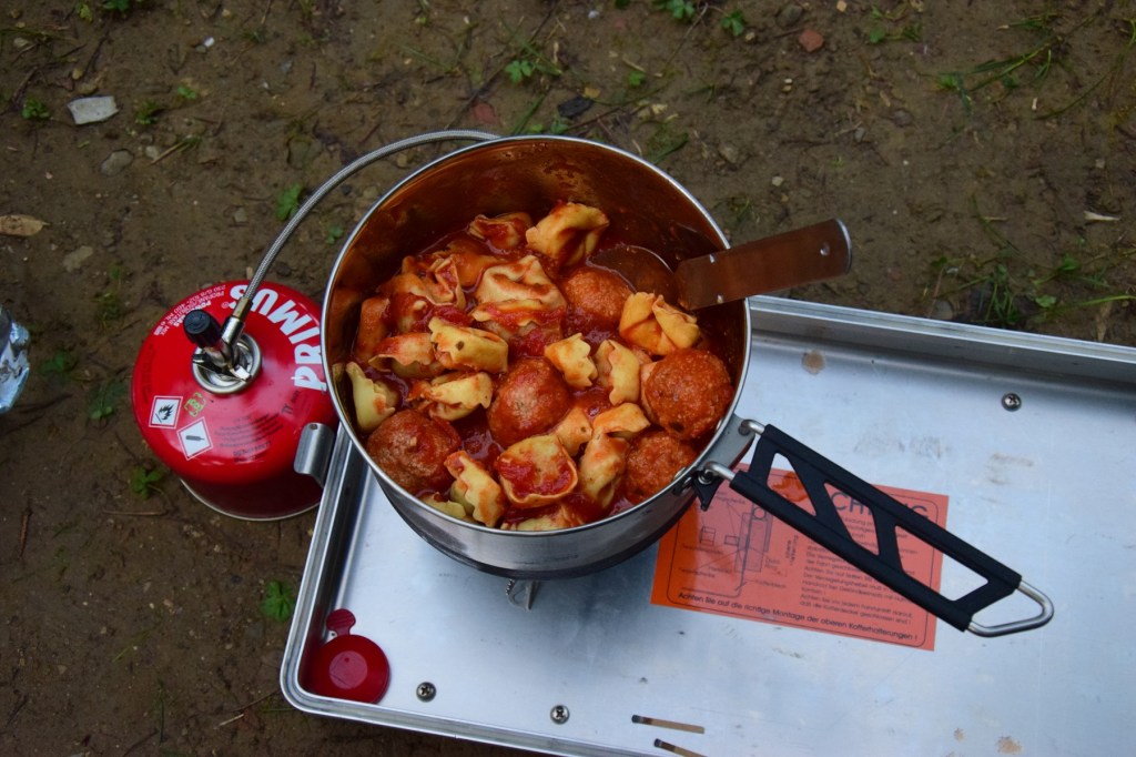 Das Essen bleibt leider etwas hinter meinen Erwartungen zurück, aber ich habe auch viel zu viel in den kleinen Topf gepackt. Hier könnte ich das nächste Mal sowieso grundsätzlich mehr abwechseln als zwischen nur Fusilli, Ravioli und Gnocchi. Zum ersten (und vermutlich letztem) Mal muss ich mein Mückenspray auspacken, denn auf diesem Campingplatz kommen sie von allen Seiten angeflogen.