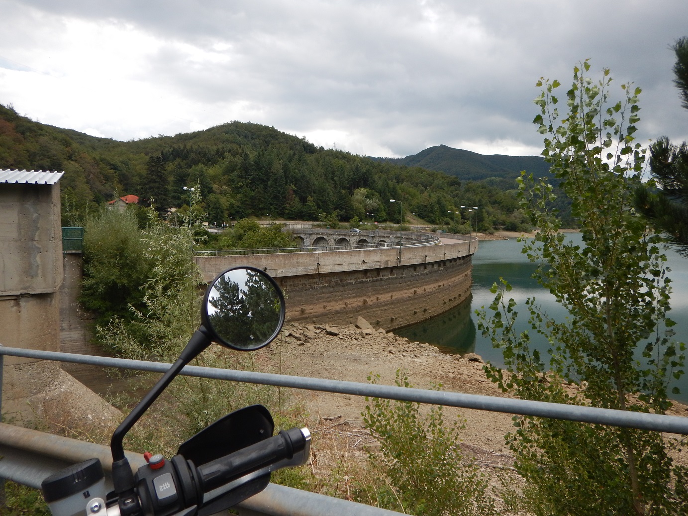 Trotz neuem Ziel bleibt der Futapass auf der Route, was den heutigen Tag zur Fünf-Pässe-Tour macht. Als ich Porretta Terme lese, ein paar kleine Tropfen abbekomme und der späte Nachmittag übernimmt, überlege ich kurz, mich in das Wellnesshotel von damals einzubuchen. Es war eher ein Betonbunker mit 70er-Charme, aber der Saunabereich war nett und das angeschlossene Restaurant ganz gut. Mir fällt der Name (Santoli) aber erst später ein, als ich längst auf dem Weg bin, außerdem wäre das recht teuer geworden. Es fühlt sich eh richtiger an, diesen dedizierten Camping-Urlaub auch nochmal mit einem Abend im Zelt zu beenden. Ich sehe Porretta Terme also nur auf Schildern, komme aber trotzdem am Staudamm vorbei, über den ich schon 2017 gefahren bin und entdecke sogar ein paar weitere Fotospots.