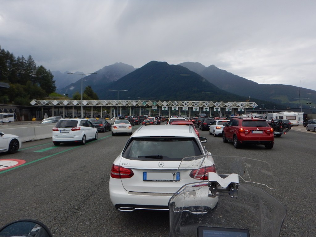 - Nochmal A 22. Als ich mir nochmal das Motorrad-Pickerl kaufe, finde ich ein normal frequentiertes WC. Danach setze ich mich kurz neben das Moped, esse ein paar Kekse und ziehe mit meiner gut gewählten Parkposition am völlig überfüllten Rastplatz weitere Motorradfahrer an. Ich packe zusammen und stelle mich weiter der Geduldsprobe Brennerautobahn.