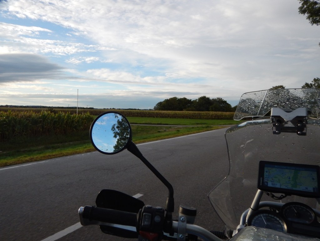 Die dunklen Wolken beunruhigen mich erst, als ich am Horizont Blitze sehe. Ich kann nicht einschätzen, ob ich genau reinfahren werde oder wie weit es weg ist, mir fällt nur ein Artikel ein, der von höchster Lebensgefahr gesprochen hat. Da es wirklich saublöd wäre, bei so einer Gelegenheit vom Blitz getroffen zu werden, fahre ich kurz von der Autobahn runter und stelle mich zum ersten Mal in meiner Motorradkarriere unter eine Brücke. Gleichzeitig sage ich meinem Kumpel, dass das mit dem Kaffee heute wohl eher nichts mehr wird.