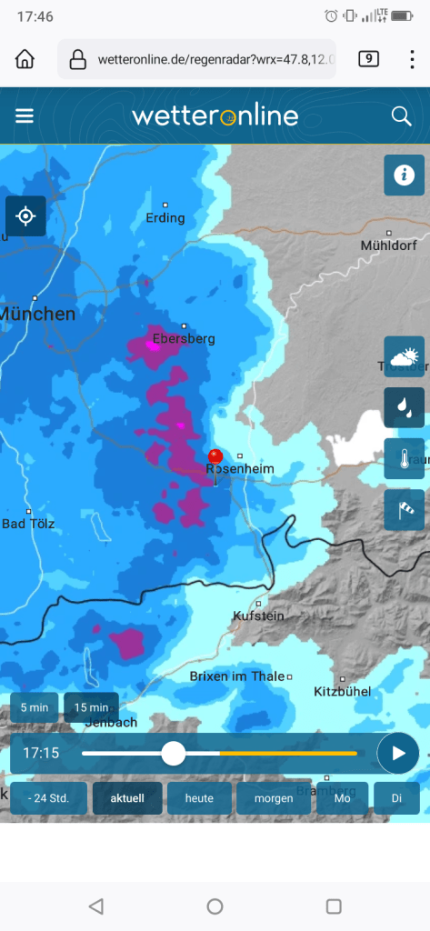 Das Regenradar informiert mich mal wieder über den Verlauf des Gewitters, durch das ich in jedem Fall gefahren wäre. Zum Glück muss ich nicht allzu lange warten und nutze die Zeit, um mich nochmal mit einer Internetrecherche rückzuversichern. Ja, Brücken sind für Fußgänger, Radlfahrer und Motorradfahrer die beste Alternative, sofern kein Gebäude in der Nähe ist. Ich bin erstaunlich abgebrüht, weil ich weiß, dass ich im Moment außer zu warten einfach nichts tun kann.