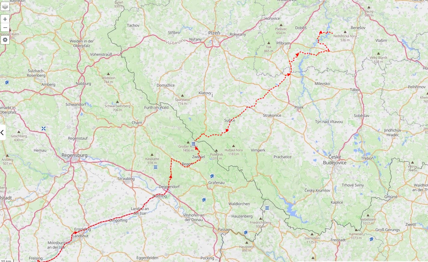 Wie an anderer Stelle beschrieben, gibt mir ein beliebtes Mittelalter-Rollenspiel einen guten Vorwand, mal wieder in die böhmischen Hügellandschaften zu fahren. Diesen Plan hatte ich bereits ab März ins Auge gefasst, aber da es die letzten vier Monate gefühlt nur geregnet hat, wurde daraus Anfang Juni. Mit, für meine Verhältnisse, ungewohnt kurzem Vorlauf von nur wenigen Tagen. Und so rolle ich am Freitagnachmittag in der ungewohnt knalligen Sonne auf der A 92 dahin, Richtung Osten. Das einzige, was mir eine Notiz wert ist, ist das Kernkraftwerk Isar 2, das mir dadurch auffällt, dass es zum ersten Mal in meinem Leben keine Wolken ausstößt. Schnell erreiche ich den Bayerischen Wald und Bayerisch Eisenstein, das ich immer mit dem Schullandheim in der vierten Klasse und der Entdeckung der Mikado-Schokosticks verbinden werde. Die dortige „letzte Tankstelle vor der Grenze“ wirkt wie eine Warnung aus einer anderen Zeit, ich nutze die Gelegenheit trotzdem, das habe ich mir während der letzten Balkanreise irgendwie angewöhnt. Ich sitze schon wieder auf der gelb-grauen Sitzbank, als mich eine Omi um Hilfe bittet, denn das wäre das erste Mal, dass sie „SB“ tankt. Ich helfe ihr gerne durch den (an sich selbsterklärenden) Touchscreen und ernte so ein leicht verdientes Dankeschön. Vorsichtshalber setzt sie das Tanklimit trotzdem auf 20 Euro.