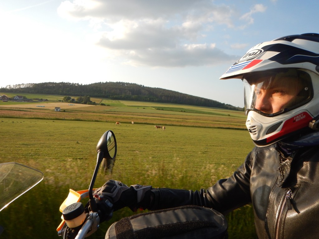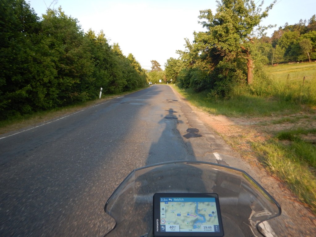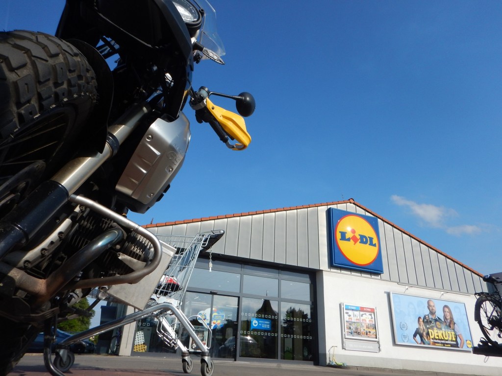 Bevor ich in den Lidl stiefel, holt mich ein tschechischer Motocyklist mit „Ahoj“ aus meiner Komfortzone und bewundert meine GS, „good, good“. Mangels Englischkenntnissen seinerseits und Tschechischkenntnissen meinerseits (ich habe tagelang mein Reisewörterbuch gesucht und nicht gefunden), füllt Zeichensprache den Rest aus. Er deutet fragend auf den ESA-Ausgleichsbehälter (oder Stellmotor? Keine Ahnung), ich versuche ihm mit den Händen die Funktion zu erklären. Mit den Worten „Veteran. GS“ wischt er durch die Bildergalerie seines Handys. Ich erwarte eine G/S, doch er zeigt mir eine orange-schwarze 1150 GS Adventure, die ich natürlich auch gut finde. Dann verabschiedet er sich, tritt seine rot-silberne Jawa an und knattert zweitaktend vom Lidl-Parkplatz. Das einzige tschechische, das wenige Minuten später in meinem Einkaufswagen landet, ist eine Dose Pilsner Urquell, bei der Hauptspeise bleibe ich bei der bewährten Gnocchi-Arrabiata-Kombi. Dazu noch ein paar Kekse und Wasser für die Bialetti. Ich fahre weiter durch das grüne Hügelmeer, das scheinbar jeden Grünton auf der Skala spielen kann und in der Abendsonne besonders leuchtet.