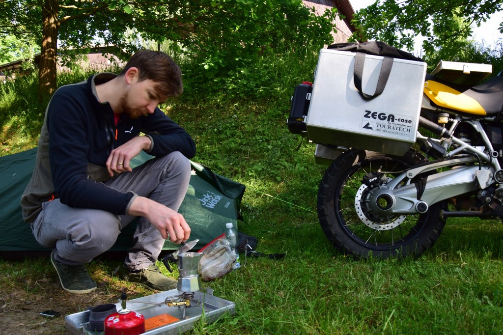 Ein zweigeteilter, aber kurzer Heimreisetag steht an. Ich bleibe noch eine gefühlte Stunde liegen, bevor ich mich aus dem engen Tunnelzelt biege. Hin und wieder überlege ich schon, ob ein größeres Zelt nicht eine sinnvolle Investition wäre. Aber das Packmaß fordert eben eine gewisse körperliche Flexibilität beim Ein- und Ausstieg. Ich zelebriere mein Frühstück (Bialetti-Kaffee und Schoko-Kekse) so gut es geht, aber an sich mag ich dieses „aus-dem-Koffer-leben“ sehr gerne. Auch wenn das in den ersten Tagen (die in diesem Kurzurlaub quasi schon gleichzeitig die letzten sind) immer etwas Chaos verlangt. Mein Physik-Dozent in Nürnberg sagte „Die Entropie nimmt immer zu“, auch im übertragenen Sinne. Zumindest bei Motorradreisen würde ich widersprechen: Hier sehe ich eher eine Gaußsche Glocke: Am Anfang ist alles ordentlich, dann nimmt das Chaos zu (die Spitze ist dann, wenn man im Supermarkt noch Sachen einkauft und sie in jede freie Ritze stopft), danach wird es immer sortierter und nach ein paar Tagen macht sogar das allabendliche Umräumen und Herumwühlen keinen Stress mehr.