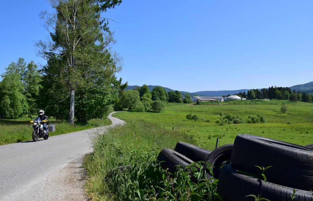Auf dem Weg Richtung Grenze kommt mir immer mehr bekannt vor, denn vor zwei Jahren bin ich von Süden her auf diese Straßen gestoßen. Das Garmin empfiehlt kurz vor der Grenze noch eine letzte kleine Nebenstraße als Alternative zur größeren Landstraße, was mir die letzte Gelegenheit bietet, nochmal ein Erinnerungsfoto zu machen. Denn meine Berichte und Fotos fallen ja schon fast traditionell deutlich ab, sobald sie den Heimreisetag beschreiben. Was aber meistens auch die Stimmung ganz gut trifft, und da ist dieser Tag keine Ausnahme.