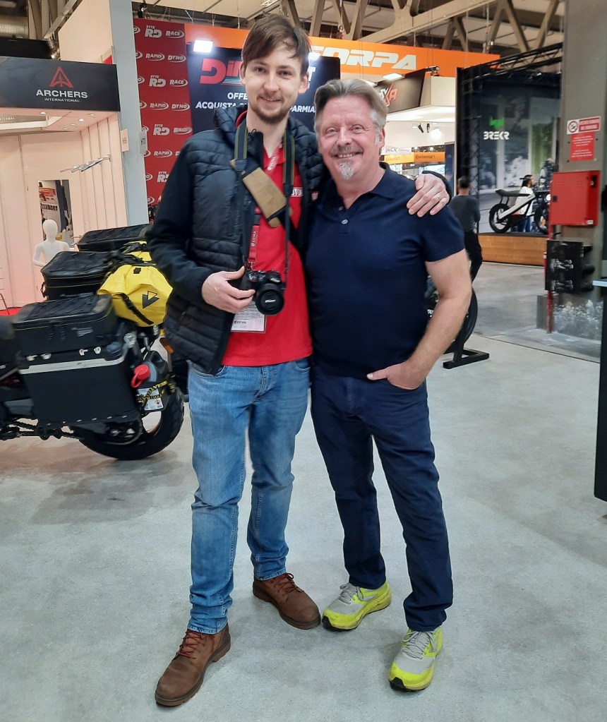 Passend zu meinem persönlichen Jubiläum habe ich nicht schlecht gestaunt, als ich auf einmal Charley Boorman beim Touratech-Stand sah. Dank Long Way Round, Race to Dakar, Long Way Down und zig weiteren Serien nicht nur für mich eine große Inspiration. Trotz meiner Redakteurs-Uniform war ich sofort in der schüchternen Fanboy-Rolle und überlegte noch, ob ich ihn überhaupt ansprechen soll. „Never meet your heroes“ sagt man ja. Aber zum Glück unterhielt sich Charley mit Teresa von Rev’it, die mit ihm schon diverse Male unterwegs war. Und da ich Teresa schon von diversen Messen kenne, stellte sie uns vor und nahm mir so zumindest einen Teil der Peinlichkeit ab. Und was soll ich sagen, vor all der Aufregung weiß ich nicht mehr so viel des ca. dreiminütigen Smalltalks, aber es war erstaunlich unkompliziert und für mich genau so, wie ich Charley eben schon aus der Zuschauerrolle kenne. Für mich das Highlight der Messe und hoffentlich ein Anlass, aus dem sich eventuell ein weiteres Treffen oder Gespräch ergeben wird.