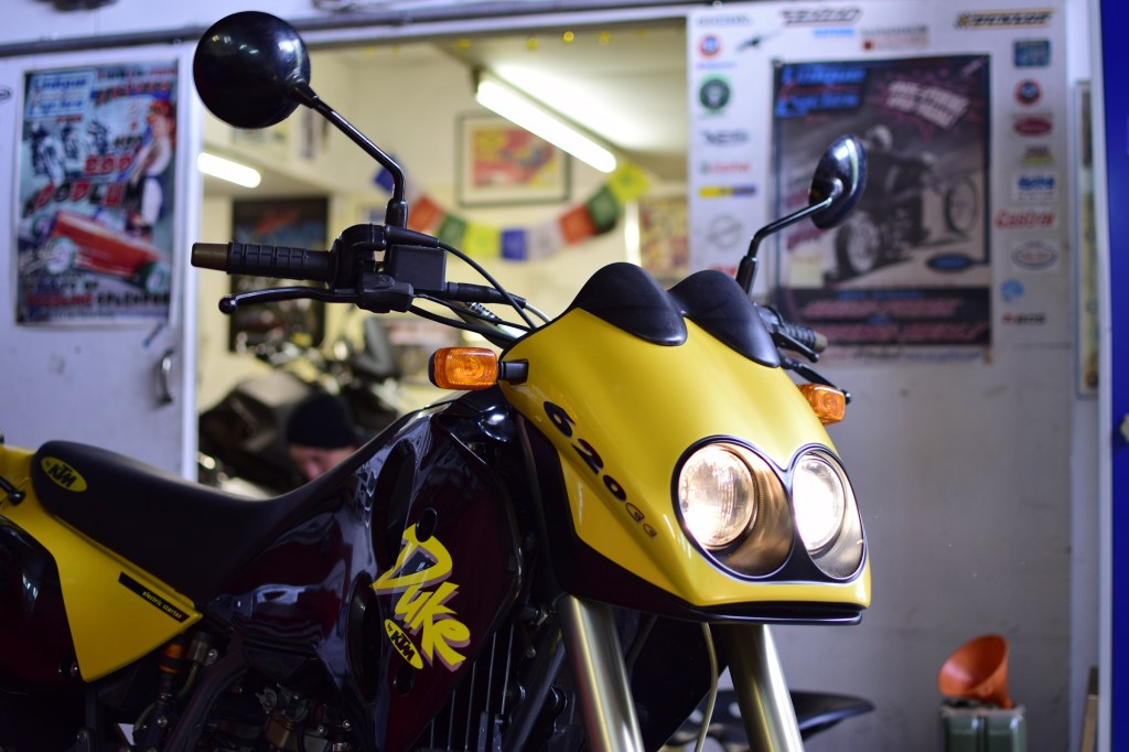 Nach rund zwölf Jahren im Dornröschenschlaf und der, sagen wir mal mit sparsamen Drehzahlniveau betriebenen Restaurierung ist die (oder historisch: der) Duke nun endlich wieder zugelassen. Mittlerweile springt der LC4-Single ja recht problemlos an, Lichter, Hupe und Bremsen funktionieren eh. Allein die Abgasuntersuchung gestaltete sich als schwierig, da die Drehzahl nach ein paar Minuten im Leerlauf immer wieder etwas absackte und der Motor schließlich absoff. Ich muss langsam wirklich mal herausfinden, wie rum der Benzinhahn nun funktioniert. Oder ob der sich über zig Jahre verflüchtigte Sprit nicht doch irgendwelche Rückstände hinterlassen hat, was damit zu tun hat. Denn mit vermeintlich „offenen“ Hahn (und genügend frischem Sprit) ging das Moped nach wenigen Minuten aus. Erst mit viel herumprobieren und umschalten auf „Reserve“ bekam ich die Duke dann nochmal zum laufen. Und da der übrige Zustand in Ordnung war, stand der erfolgreichen technischen Abnahme auch nichts mehr im Wege.
