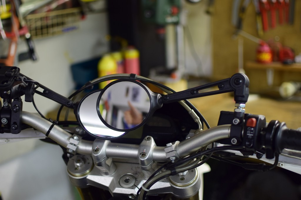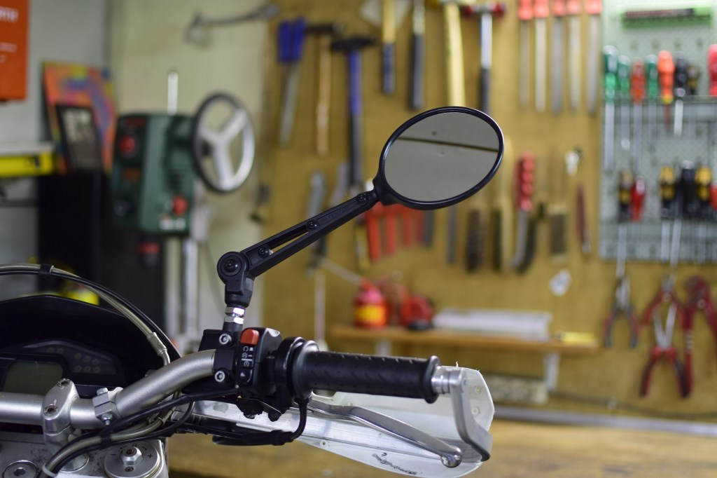 Das zweite, was ich ausgetauscht habe: Ich habe die Spiegel durch die schnell klappbaren Adventure-Spiegel von Touratech ersetzt. Diese rasten in mehreren Positionen ein, vor allem aber lassen sie sich quasi mit einem (oder zwei) Handgriffe(n) in die Mitte klappen. Nicht, weil man den Tacho im Gelände nicht mehr ablesen braucht, sondern damit sie im Fall der Fälle™ nicht abbrechen. Wie schon anderswo geschrieben, habe ich lange mit mir gehadert bzw. mit den Teilen geliebäugelt, denn vergleichbare Modelle (z. B. mit einer Montage via RAM-Mount) finde ich zum Teil unsäglich hässlich. Diese Spiegel aber kommen dem runden Old-School-Spiegel der Serienausstattung recht nahe und der Spiegelarm trägt nur wenig auf. Außerdem waren die Spiegel nicht wirklich teuer. Größtes Kaufargument war aber die Erfahrung, die ich mit einem ähnlichen Modell bereits auf der 790 Adventure R von Touratech machen durfte. Beim Touratech Active Adventure, aber auch später auf den Pisten in Slowenien und Bosnien.