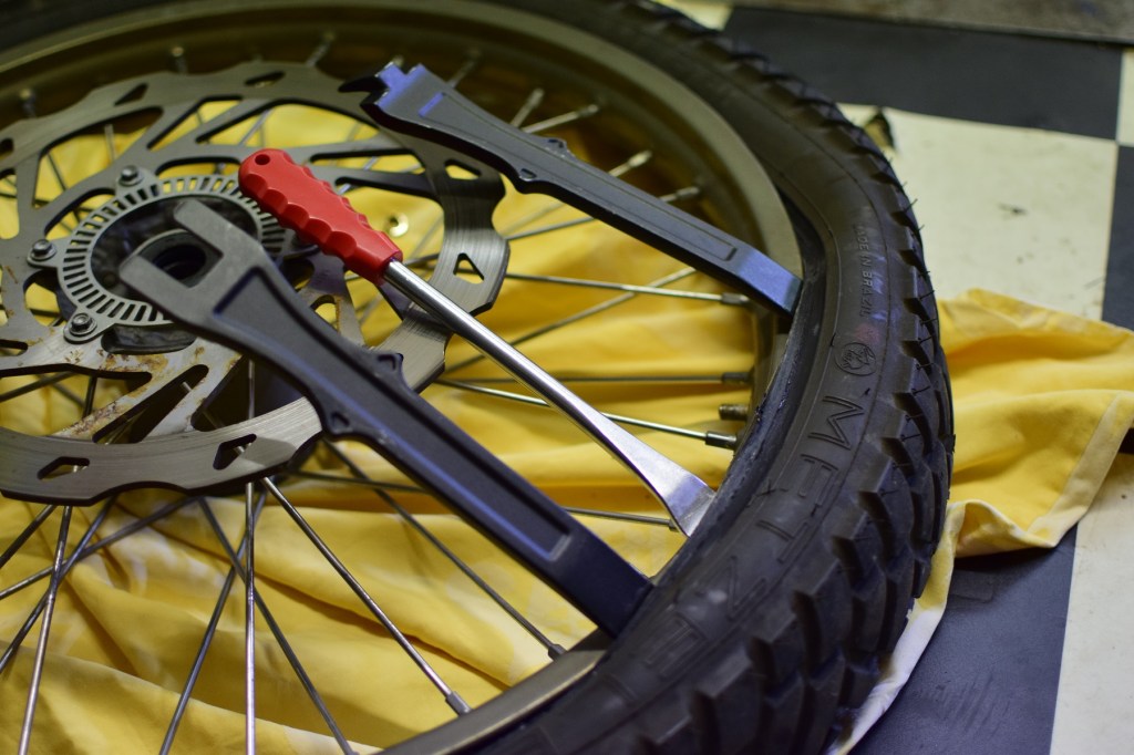 Und damit zum Hauptdarsteller dieses Absatzes, dem Reifenwechsel. War schließlich eine top Gelegenheit, das mal wieder unter kontrollierten Bedingungen gemacht zu haben. Und nicht erst auf einer steinigen Piste mitten im Nirgendwo, während es immer dunkler wird. Guter Plan, dachte ich zumindest. Die Räder waren immerhin schnell abgebaut. Mit Aussicht auf ein erstes Erfolgserlebnis startete ich am Vorderrad. Die Montiereisen mussten den Metzeler Enduro 3 nicht besonders lange überreden, aber dass dieser Allroundreifen relativ einfach zu montieren war, das hatte ich noch im Kopf.