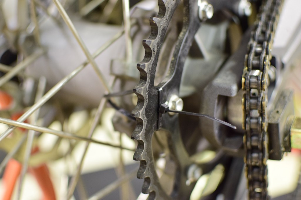 Leider half das nicht wirklich. Und so retteten mal wieder Kabelbinder den Werkstattausflug und den Tag. Damit konnte ich das Kettenrad an die Speichen ziehen und gewann so die entscheidenden Millimeter, um das Rad zwischen Bremssattel und Schwinge einfädeln zu können. Das, was mir früher auch gerne mal Kopfzerbrechen bereitete, nämlich die Kettenspannung, war dagegen eine routinierte Angelegenheit. Eine Kontrolle mit dem Messschieber beseitigte die letzten Zweifel.