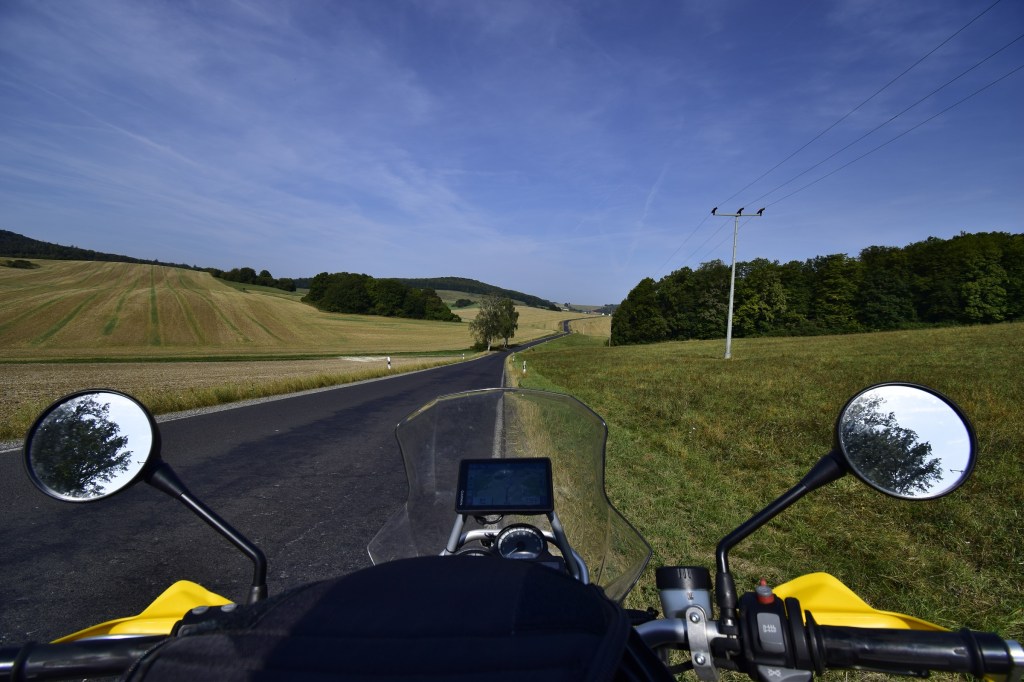 Der zweite Tag meines Kurzurlaubs begann einigermaßen routiniert, zumindest bis sämtliche Streichhölzer aller drei Packungen (don’t ask) versagten und der Kaffee in der Bialetti trocken blieb. Schon in Motorradstiefeln (Ende August ist es morgens und abends ja durchaus etwas klamm) steuerte ich auf das Camper-Pärchen gegenüber zu, die mir schon gestern ganz sympathisch waren. Sofern man das vom Leute beobachten so sagen kann. Ein Feuerzeug hatte das fränkisch-englische Paar zwar nicht, aber einen Feuerstein, der meinen Gaskocher aber genauso gut entzündete. Wieder was gelernt. Sowas hab ich ja sogar in der Schublade liegen, aber beim Moto-Camping hatte ich dann doch immer lieber Feuerzeug oder Streichhölzer dabei. Einem gelungenen Start in den Tag stand damit nichts mehr im Wege, auch keine Rechnung, denn die 14 Euro hatte ich gestern schon bezahlt. Meine Tour ging so weiter, wie sie am Vortag endete: Mit weiten Bögen am Fluss entlang. Dann steuerte ich auf den Würgauer Berg zu, der am Wochenende für Motorräder gesperrt ist. Thank God it’s Friday. Wirklich spektakulär war die Strecke allerdings nicht, aber gut, in Mittelgebirgslagen nimmt man, was man kriegt. Mittlerweile war ich tief in der oberfränkischen Provinz in all ihrer Idylle, ratterte über Kopfsteinpflaster in Kleukheim, vorbei an einer herausgeputzten Kirche und hübschen Fachwerkhäusern, ein kleiner Bach direkt an der Hauptstraße machte das Bild perfekt. Noch schöner wäre es vielleicht an einem verschneiten Winterabend. Zwischendurch war ich dann auch unbeabsichtigt auf der Deutschen Fachwerkstraße unterwegs, nach Abschnitten auf der Hopfenstraße und Limes-Straße schon die dritte Ferienstraße.