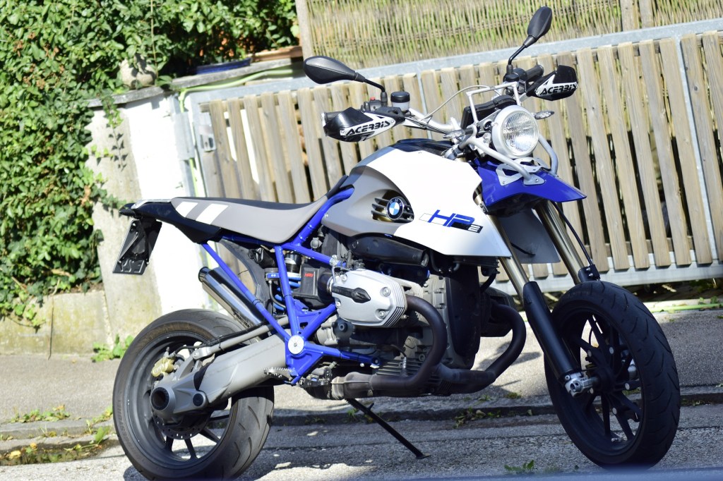 Ein paar Tage später holte ich dann die HP2 von der Werkstatt. Obwohl ich sie in den letzten Jahren immer mal wieder gefahren bin (u. a. auch mal von Stuttgart nach Freising), hatte ich komischerweise keine starken Erinnerungen an das Fahrgefühl. Ich muss wohl sehr vorsichtig gefahren sein, denn mir fiel nur der im Vergleich zu meiner GS rauhere Motorlauf ein – was u. a. an der eingesparten Ausgleichswelle liegt. Aber richtige Fahreindrücke? Hmm. Da war ich nur angefixt von den zeitgenössischen Berichten, die ich mir in der Zwischenzeit reingezogen habe. Nach dem Anlassen war das alles wurscht, schon im Leerlauf hatte ich ein breites Grinsen im Gesicht. Ich hatte (wie immer) nicht viel Zeit, aber einen kleinen Umweg nahm ich schon, und nach zwei Kurven war ich verblüfft. Ich erinnere mich an kein Motorrad, dass derart leichtfüßig einlenkt. Liegt natürlich am gerade montierten Supermoto-Radsatz. Trotzdem: Kaum zu beschreiben, wie dieses Ding um Gullideckel tänzelt. Mit etwas angewärmten Motor riss ich das Gas mal gefühlt 40 bis 50 Prozent auf… pow, zieht einem das Ding die Arme lang, was für ein Boxer-Punch! Heftig. Um diese lange Geschichte abzukürzen: Die F 900 GS war danach sowas von vergessen, verdrängt, ausradiert von der HP2. Was für ein Motorrad!