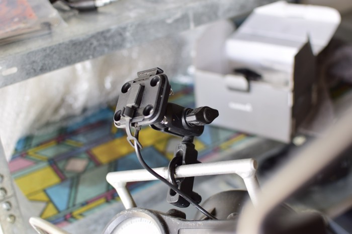 Als nächstes baute ich meinen Navi-Halter dran. Ich überlege zwar seit Wochen, mir eine elegantere Lösung zu besorgen, die das Navi direkt an die Strebe positioniert, aber auch diese rund 25 Euro möchte ich mir im Moment sparen. An der GS hatte ich dieses Thema ja schon und mittelfristig werde ich den Garmin-Halter bestimmt ersetzen.
