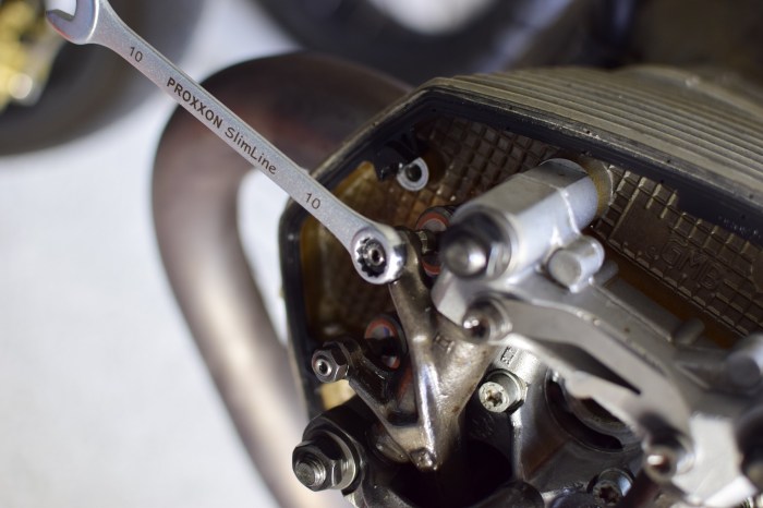 Für das Aufbocken, Entfernen der Zündspulen, Ausdrehen der Zündkerzen, Abbauen der Zylinderkopfhaube habe ich dann vermutlich wieder fünfmal so lange gebraucht wie andere, aber das hat bei den heutigen Temperaturen und dem entspannten Zeitfenster echt Spaß gemacht. Allein für die Suche nach dem „richtigen“ oberen Totpunkt habe ich schon ein paar Mal am Rad gedreht, um auf Nummer sicher zu gehen. Dafür gab es heute keine Sauerei mit dem herauslaufenden Öl – wenn Motoröl im Spiel ist, ist das sonst eigentlich immer eine Garantie für Schmierstoff an Stellen, wo er nix verloren hat.