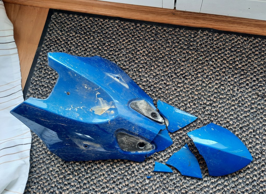 Eine erste Bestandsaufnahme: Alles halb so wild – es lief nichts aus, der gerade noch montierte Adventure-Spiegel klappte weg, ohne Schaden zu nehmen und auch an der noch ungeschützten Zylinderkopfhaube war nichts zu sehen, außer ein paar kleinen Kratzern mehr. Offensichtlichster Schaden war der kurze Kotflügel, der den Kampf gegen den Kofferträger meiner danebenstehenden GS verlor.