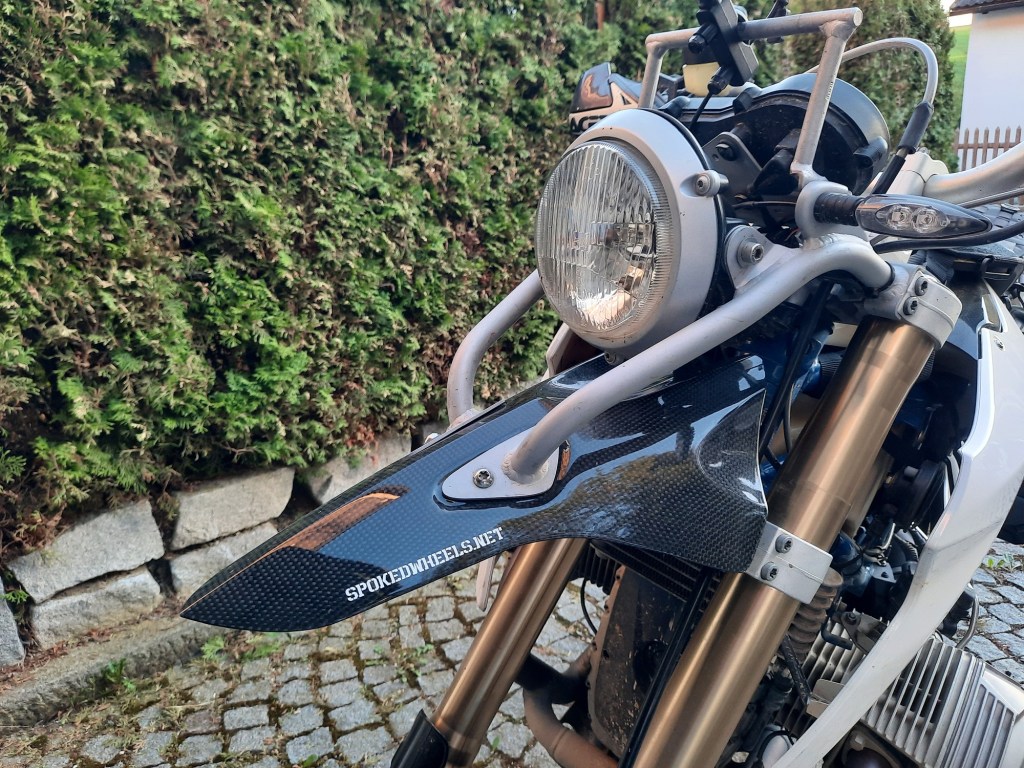 Leider gehört der Fender zu den Teilen, die im schrumpfenden Ersatzteileangebot nicht mehr verfügbar sind. Aber „Krise“ und „Chance“ sollen im Chinesischen ja angeblich das gleiche Schriftzeichen sein. Und durch die weit vernetzte HP2-Community tat sich dann schnell ein edles Ersatzteil aus Kohlefaser auf, das als Gebraucht-Teil genauso teuer war, wie das Originalteil. Was gleichzeitig erneut die Frage aufwirft, ob man so ein Gerät dann wirklich im Gelände fahren möchte. (Antwort: Ja, trotzdem.)