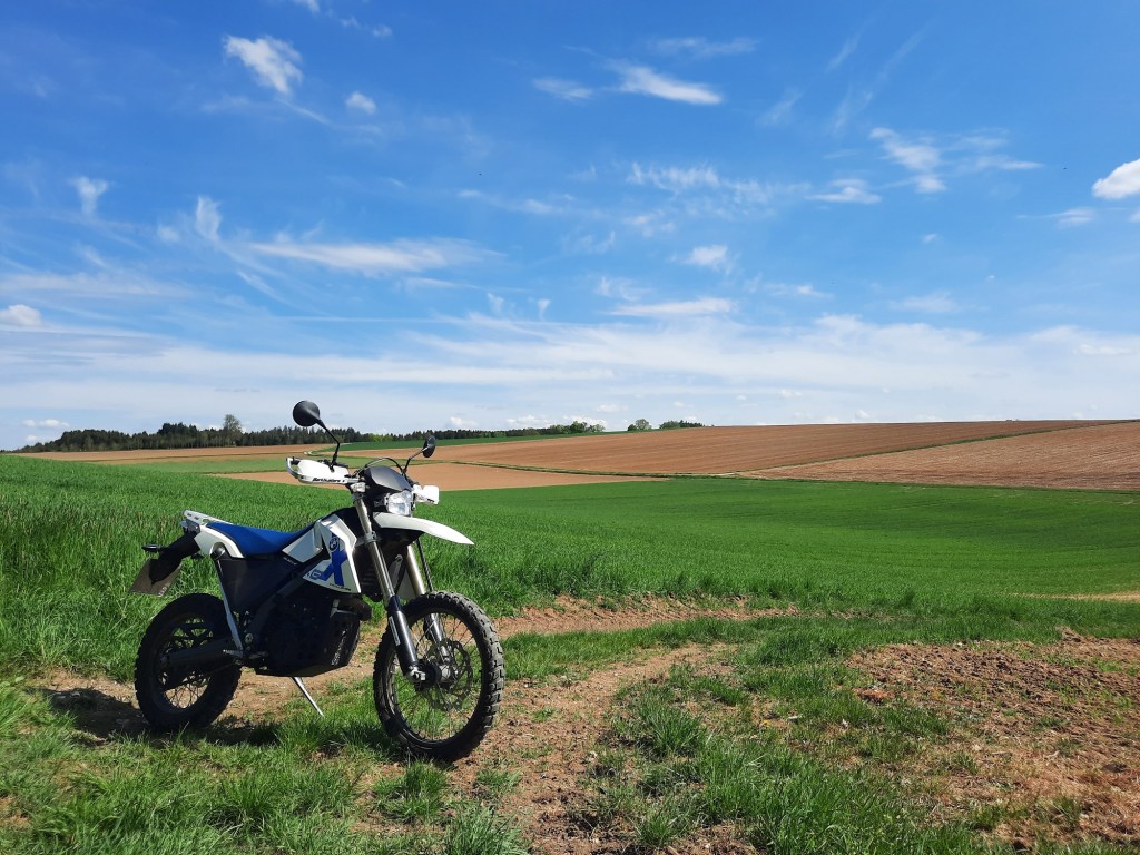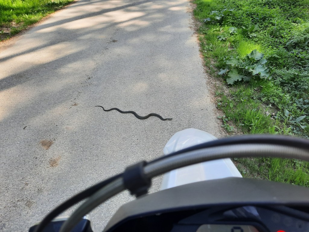 Und so pröttelte sich der leichtfüßige Einzylinder schon nach wenigen Metern zurück in mein Herz. Denn mittlerweile kann ich nach wenigen Hundert Metern auf einen Feldweg abbiegen, machte dann ein paar Aufwärmübungen und erkundete wieder ein paar Wege, die alle ohne Verbotsschild auskommen und mich damit etwas entspannter fahren lassen. Krönung der kurzen Ausfahrt war eine auf der Straße liegende Ringelnatter, die ich zum Glück rechtzeitig erkannte. Nach dem Absteigen schlängete sie sich elegant zurück ins Gebüsch.